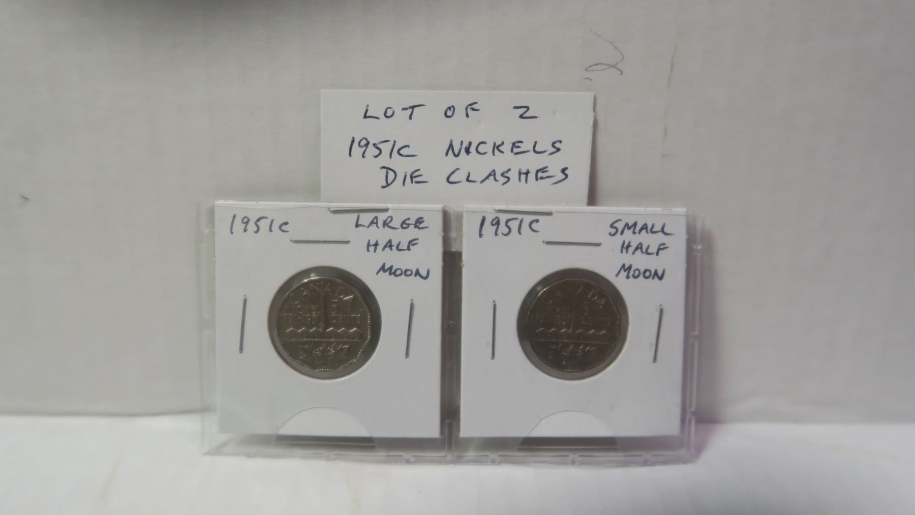 Lot of 2 different Canadian 1951C 5 Cents Nickels with different Die Clashes. Includes Large Half Moon & Small Half Moon varieties.