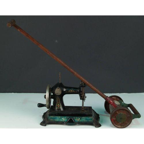 Lot of 2 early toys, small lawn mower & fancy sewing machine