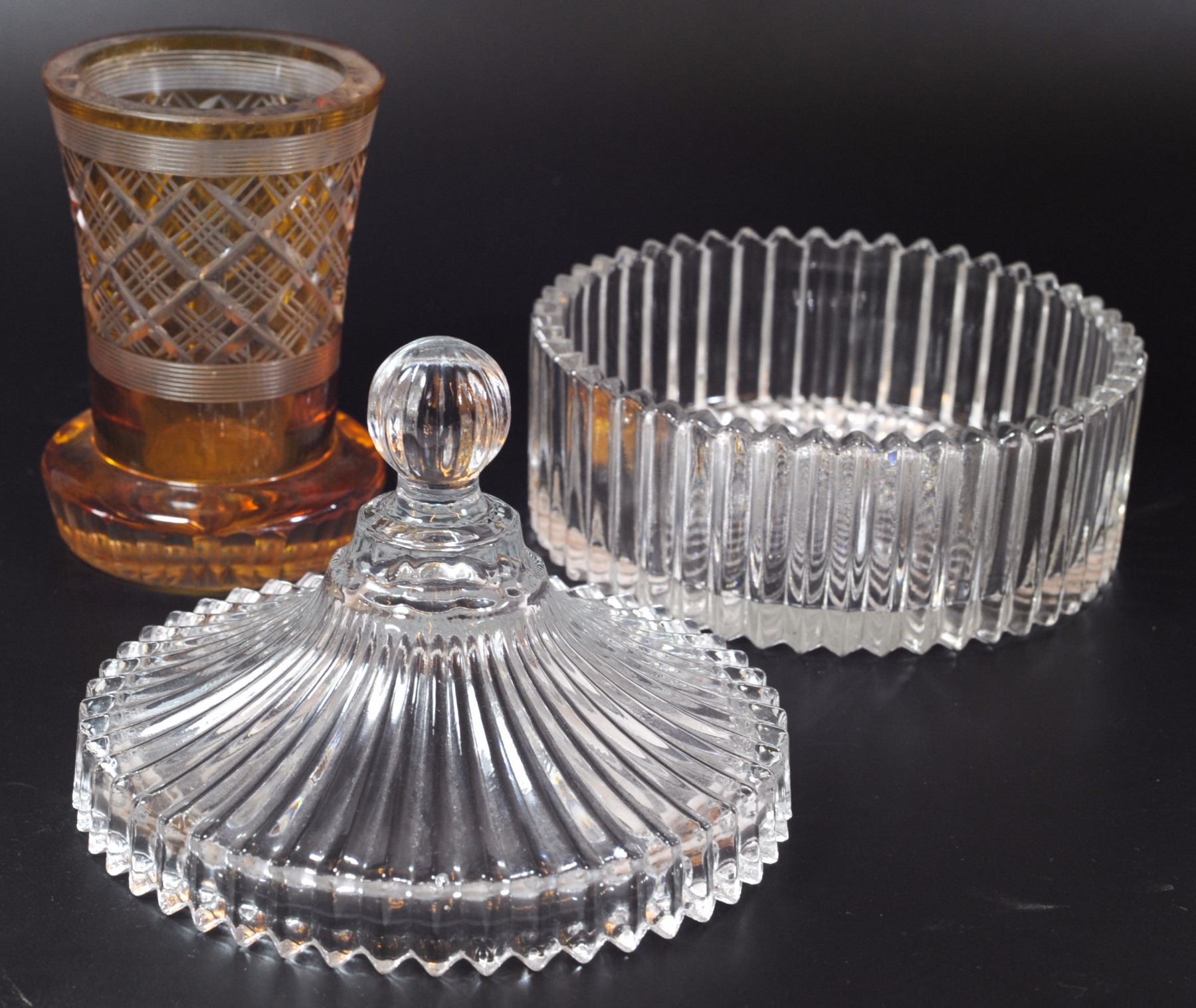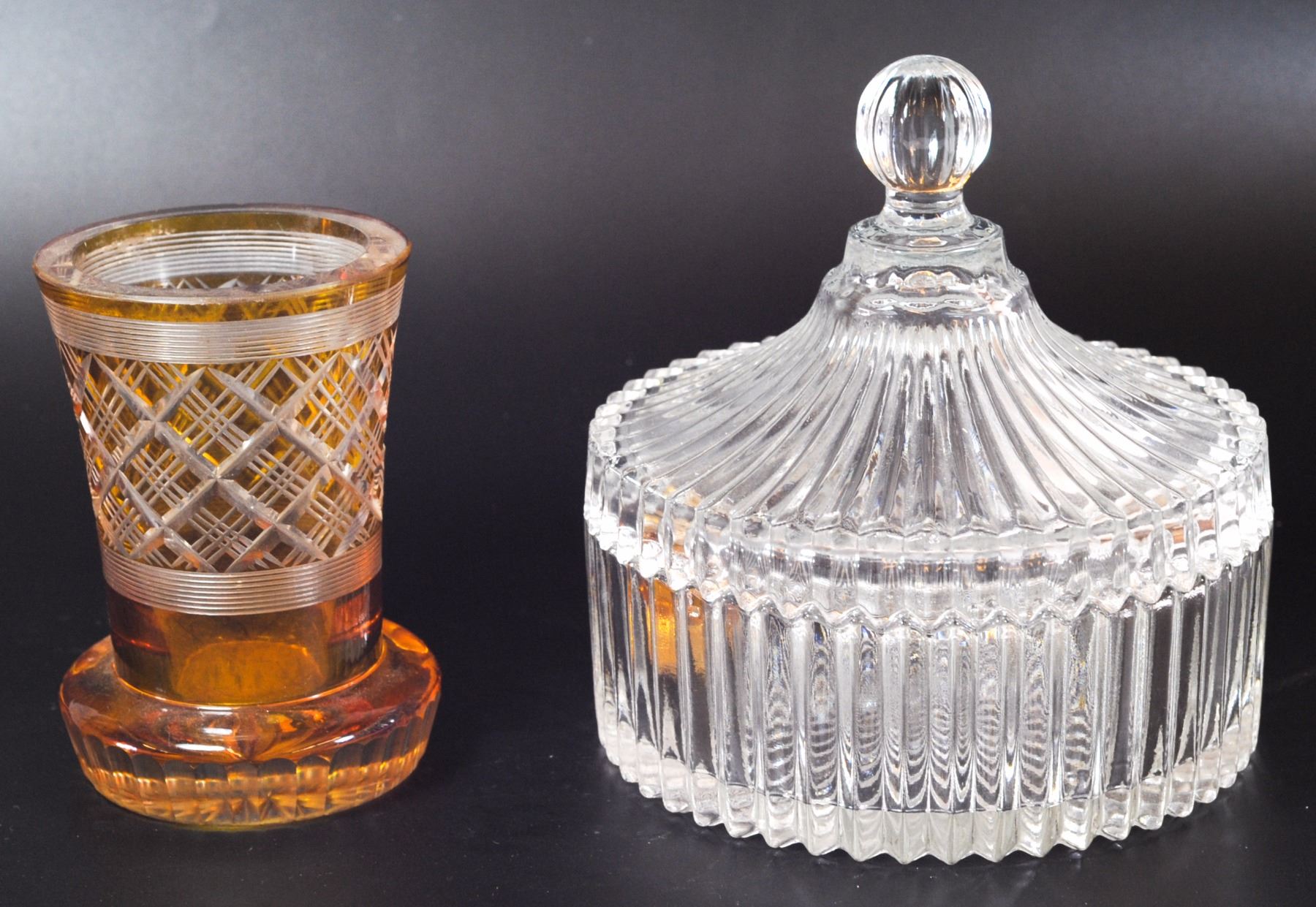 Lot of 2 glass items: 1. Old Bohemian goblet, first half of the 20th century, with hand-carved surrounding embellishments in the shade on amber against a transparent background. Height: 12 cm. 2. Bomboniere (candy bowl with cover), transparent glass designed like geometric slices, diameter: 15 cm.
