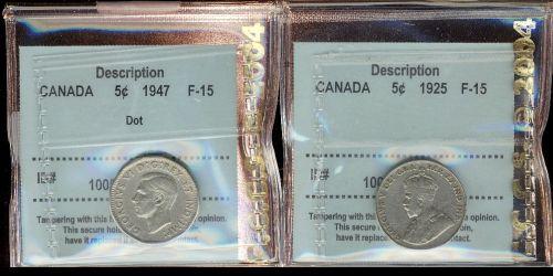 Lot of 2 graded Five cents; 1925 ICCS, 1947 Dot CCCS. Both F15.