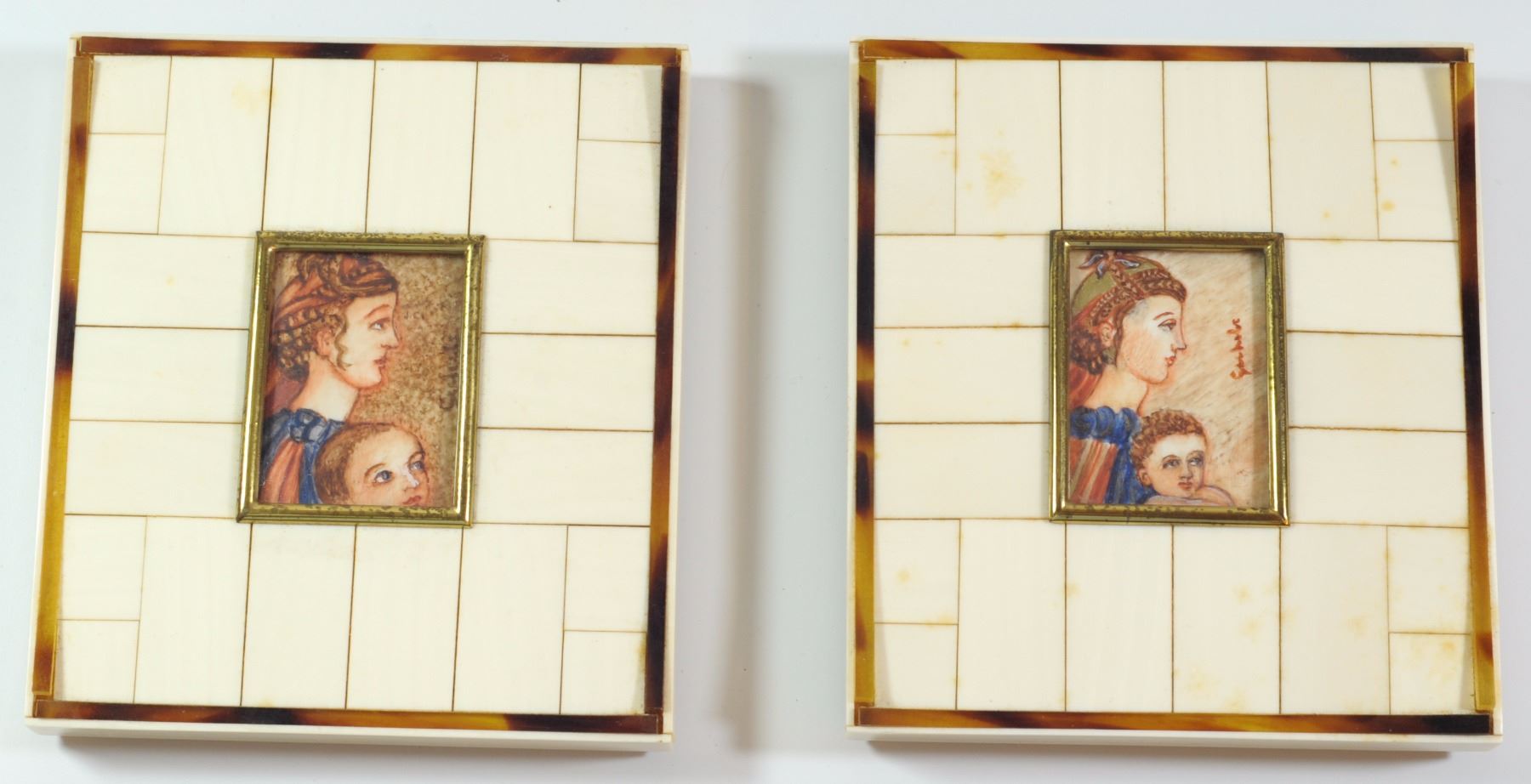 Lot of 2 hand-painted miniatures, mother and son, come in ivory frames with tortoise shell embellishments, frames slightly flawed: the tortoise shell embellishments are slightly detaches in the edges, dimensions of minitures: 3.5x4 cm, dimensions of framed: 9x10.5 cm.