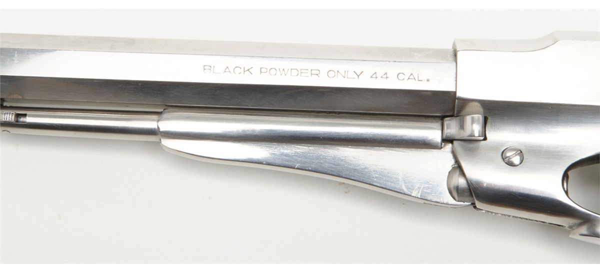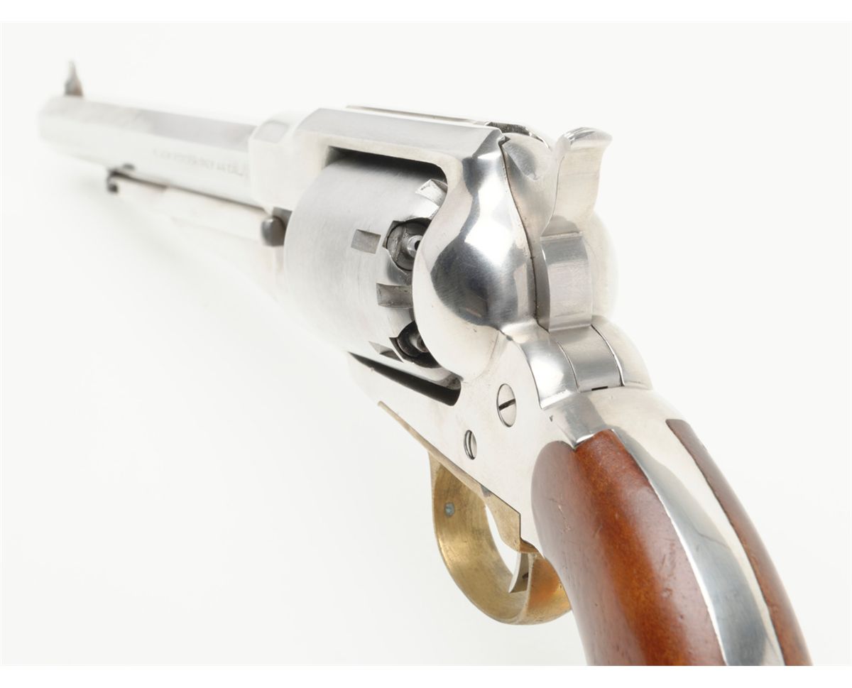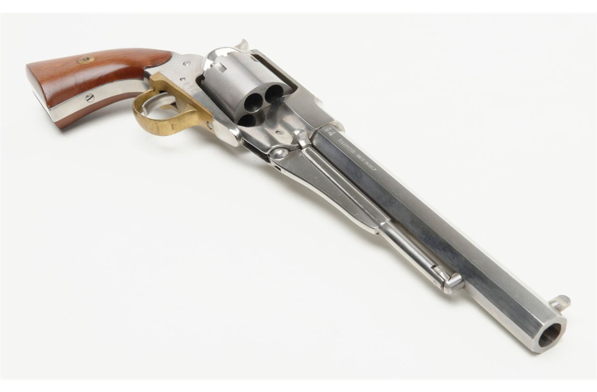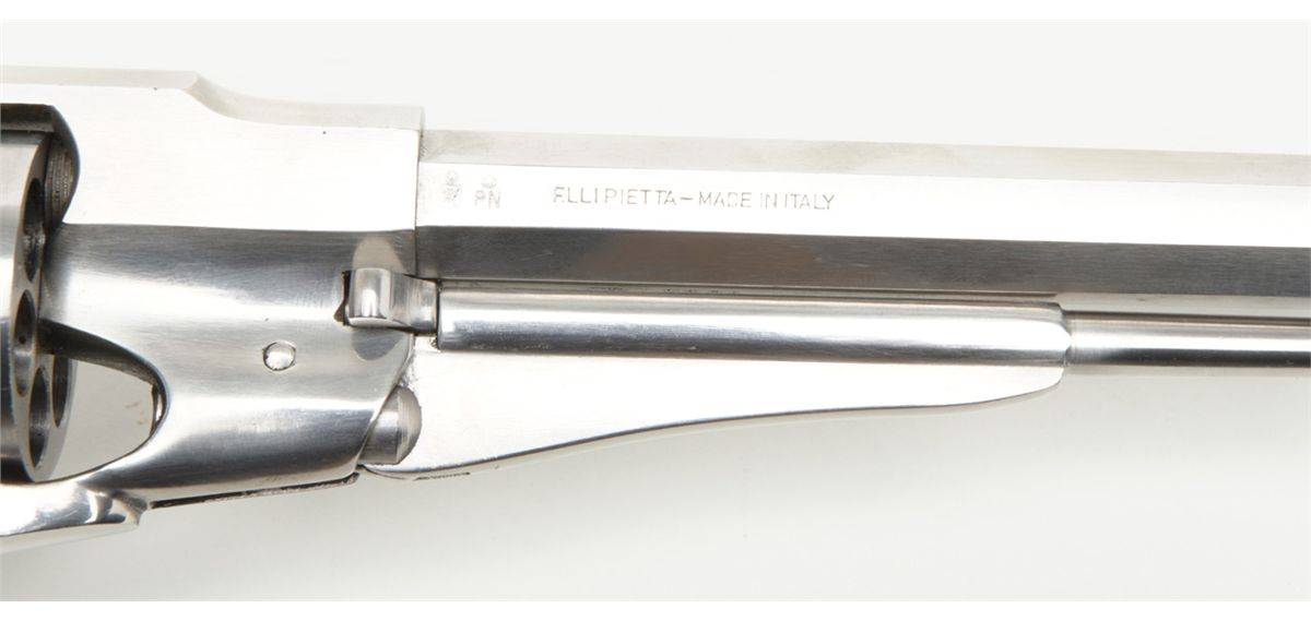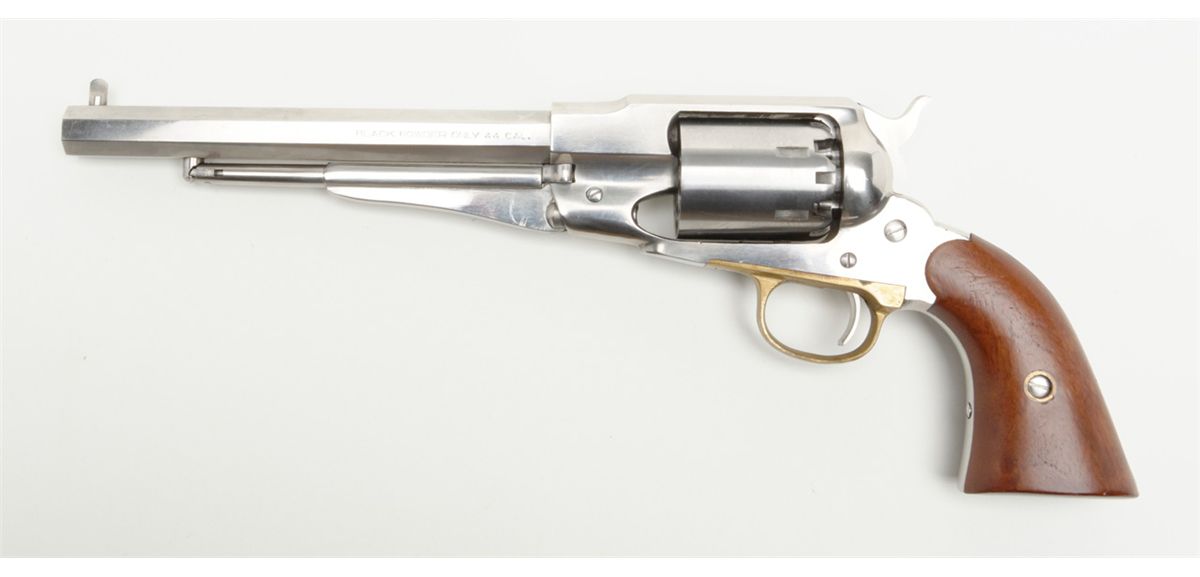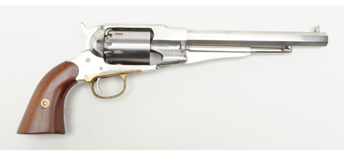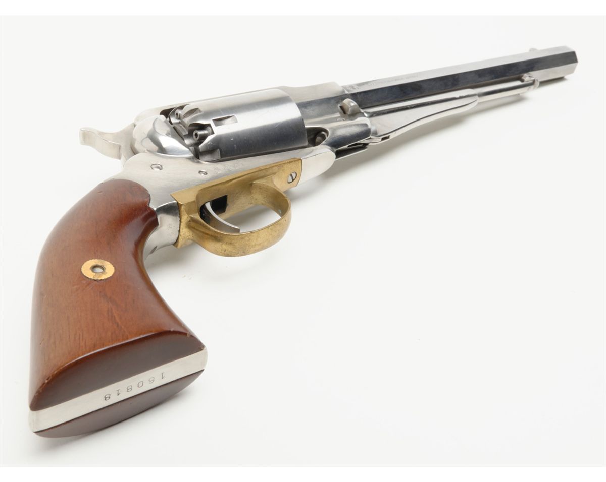 Lot of 2 items: Italian reproduction of a Remington Model 1858 percussion revolver, .44 cal., 8” octagon barrel, stainless steel, wood grips, #160818 in fine condition with a fine bore, action, markings and grips and a Knights of Columbus type lodge sword and scabbard with name “C.W. Case” etched on blade; fair condition with heavy un-cleaned patina. Est.: $65-$130.