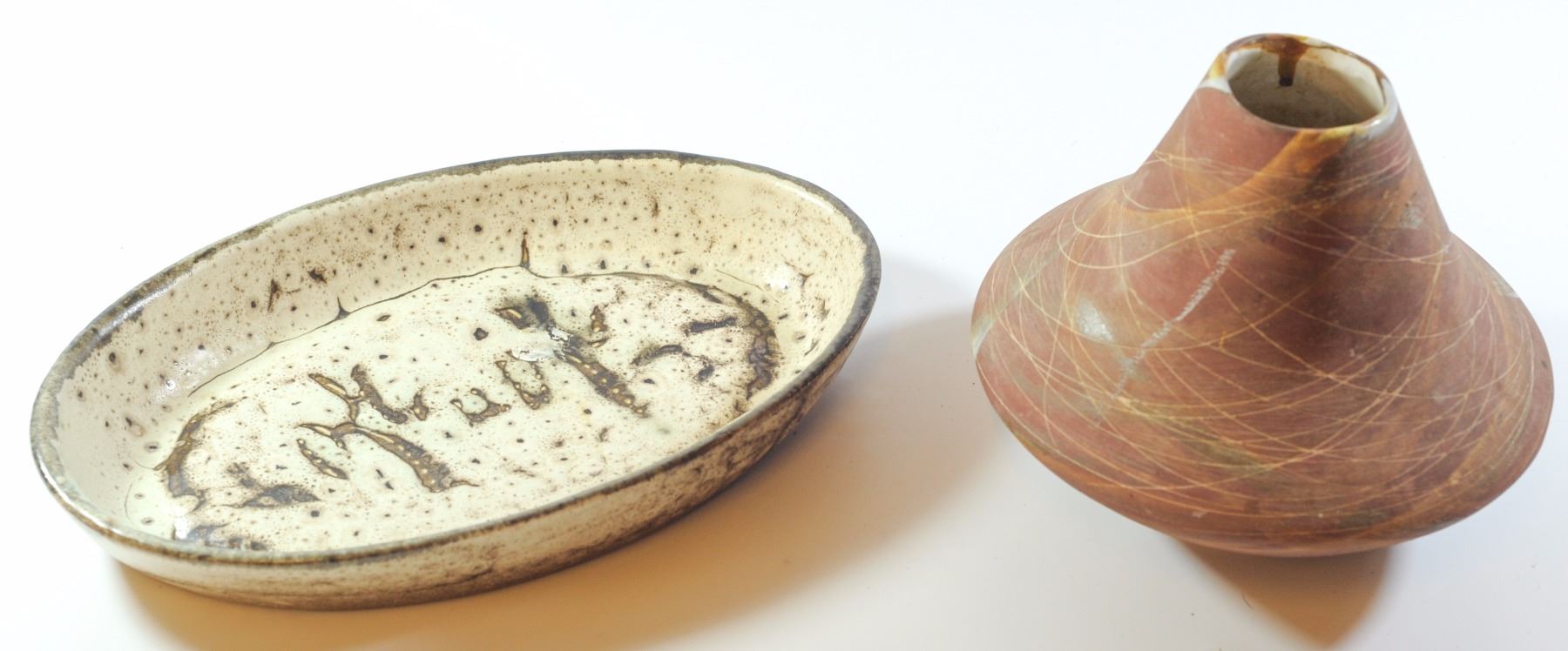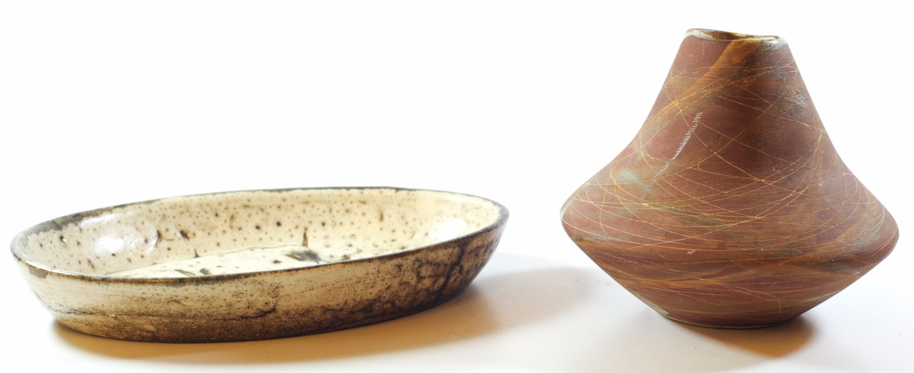 Lot of 2 items by Harsa Beersheba, includes: 1. Vase designed by Azaz, with brown glazing, 2. Oval tray, signed, height/length: 14-24 cm.