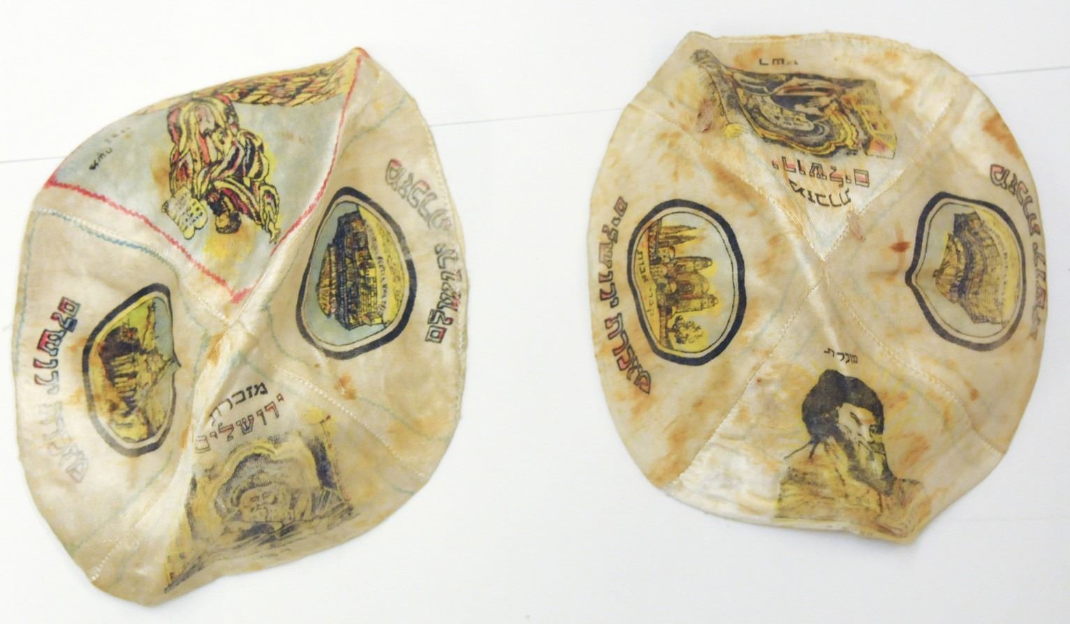 Lot of 2 kippas - souvenir from Jerusalem, Mandatory Palestine, one is embellished with color prints of the Dome of the Rock, Yad Avshalom and the figures of Moses and Rashi. The other is decorated with the Dome of the Rock, holy tombs and the figures of Baal Shem Tov and Rashi. Reasonable condition: faded, stains.