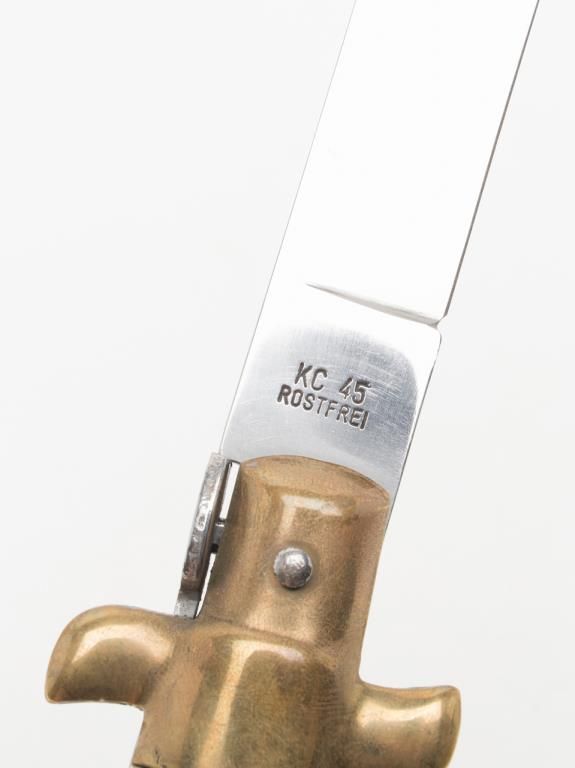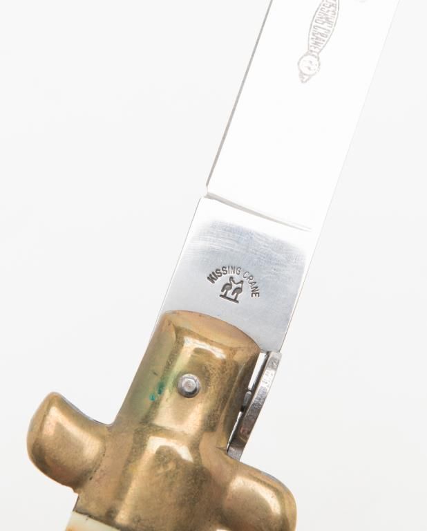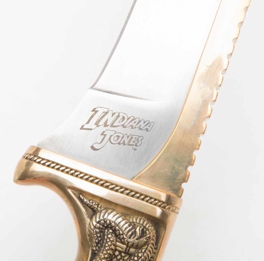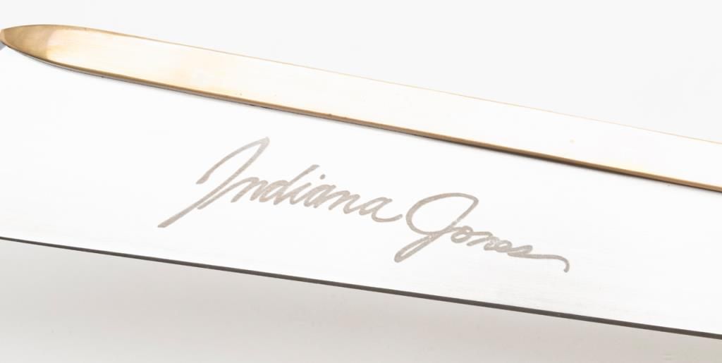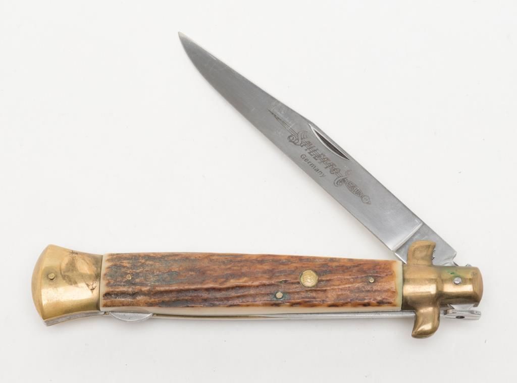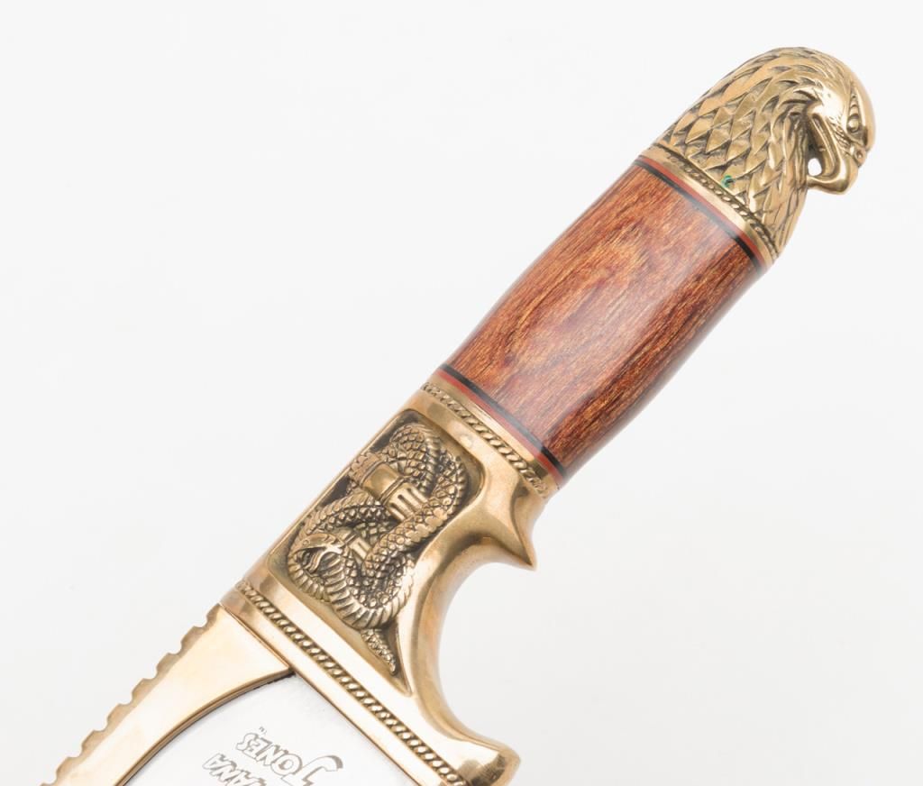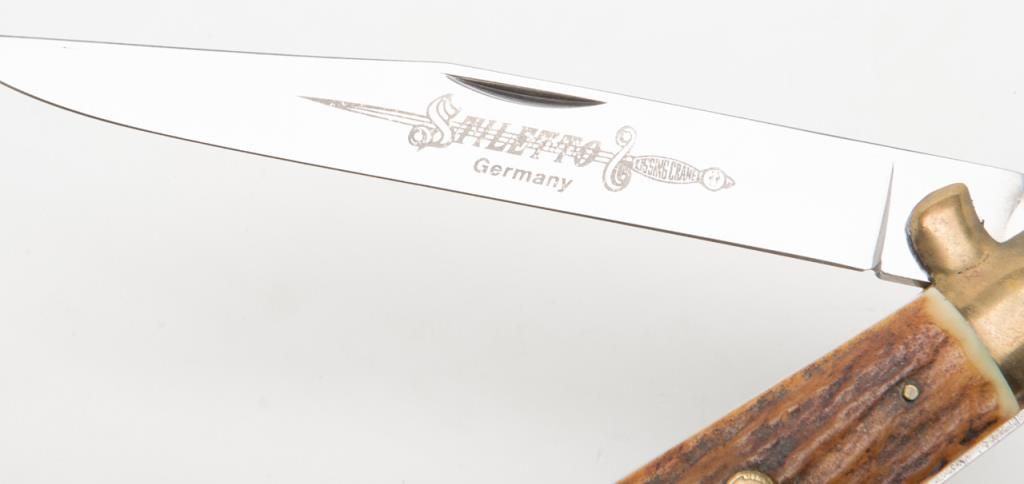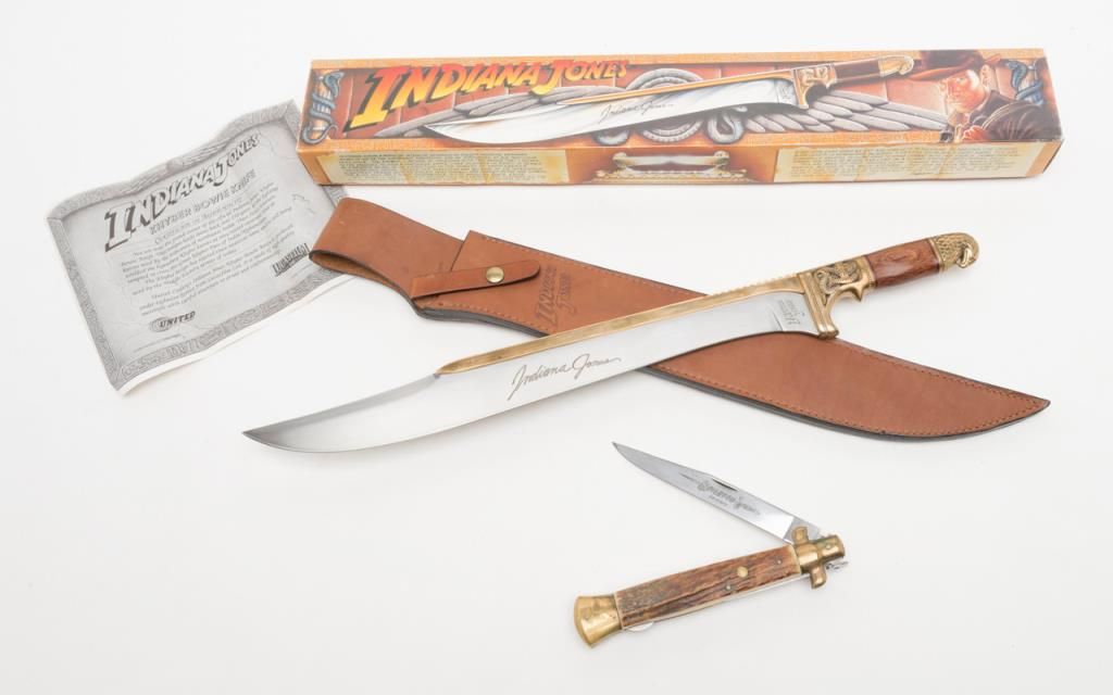 Lot of 2 knives including a large German folder with stag scales, approx. 8” overall when closed in fine condition; also a huge Modern Khyber Bowie Fantasy Indiana Jones knife with heavy leather sheath, approx. 25” overall in two-piece cardboard box, like new condition. Est.: $75-$125.