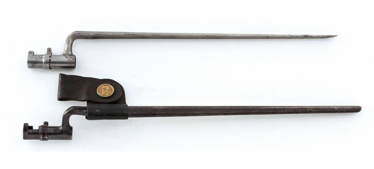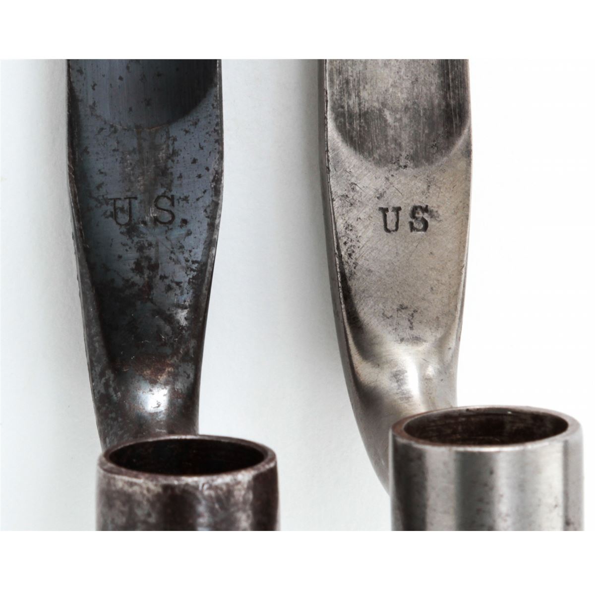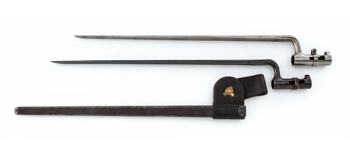 Lot of Two (2) Late 19th Century U.S. Socket Bayonets, one for Civil War musket, the other for Trapdoor rifle. Both in very good condition. Trapdoor bayonet with New Jersey Militia scabbard. Civil War example lacks scabbard. Est.: $125-$250/lot.