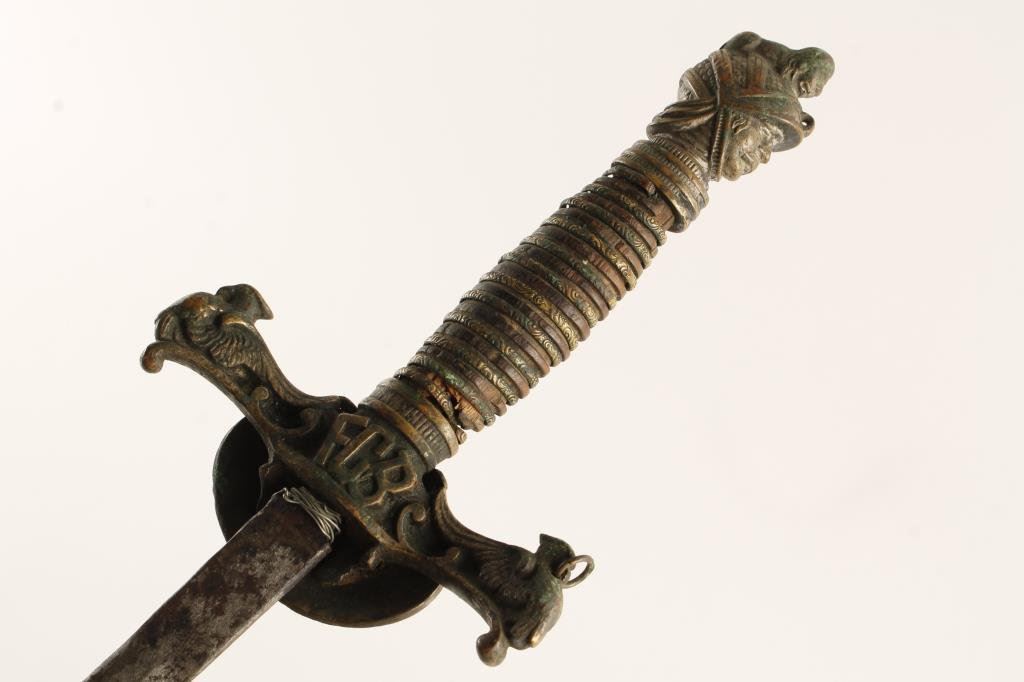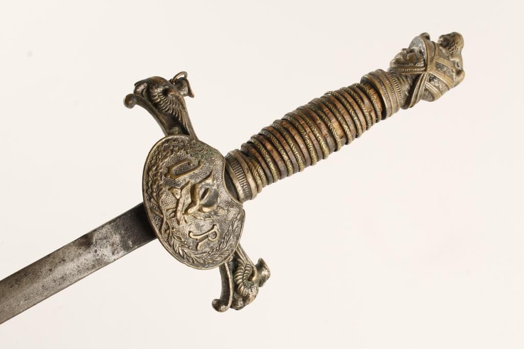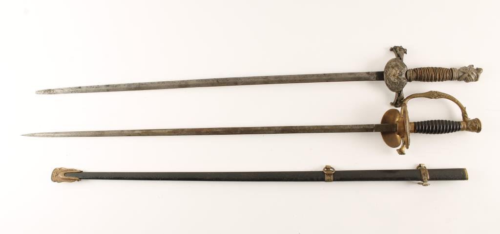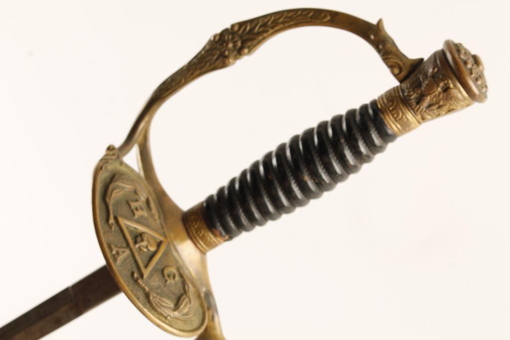 Lot of 2 lodge swords; one with a metal scabbard and brass mounts; guard shows embossed triangular insignia with H G A surrounding it; no maker’s name visible on blade; overall fair condition; the second sword is in rough condition and without a scabbard; the guard shows initials of “FCB” on one side and “J R” on the other; brass knight’s head pommel. Est.: $150-$300.