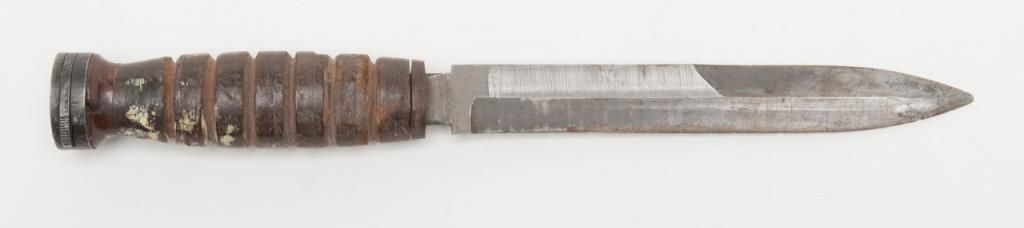 Lot of 2 military bladed weapons including a KA-BAR knife, missing guard, with stacked leather grip and U.S.M8A1 sheath showing damage to tip and a European un-marked bayonet and metal scabbard with woven hanger in very good to fine condition. Est.: $30-$60.
