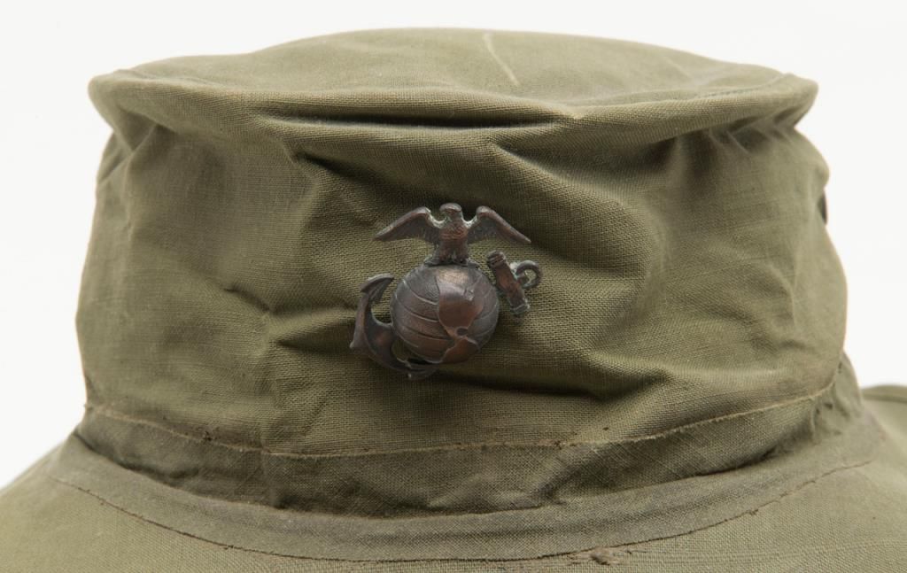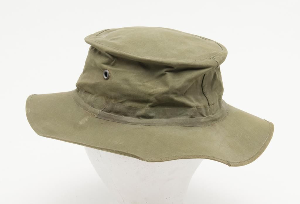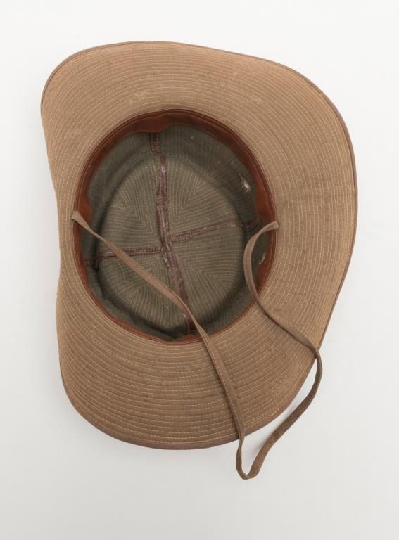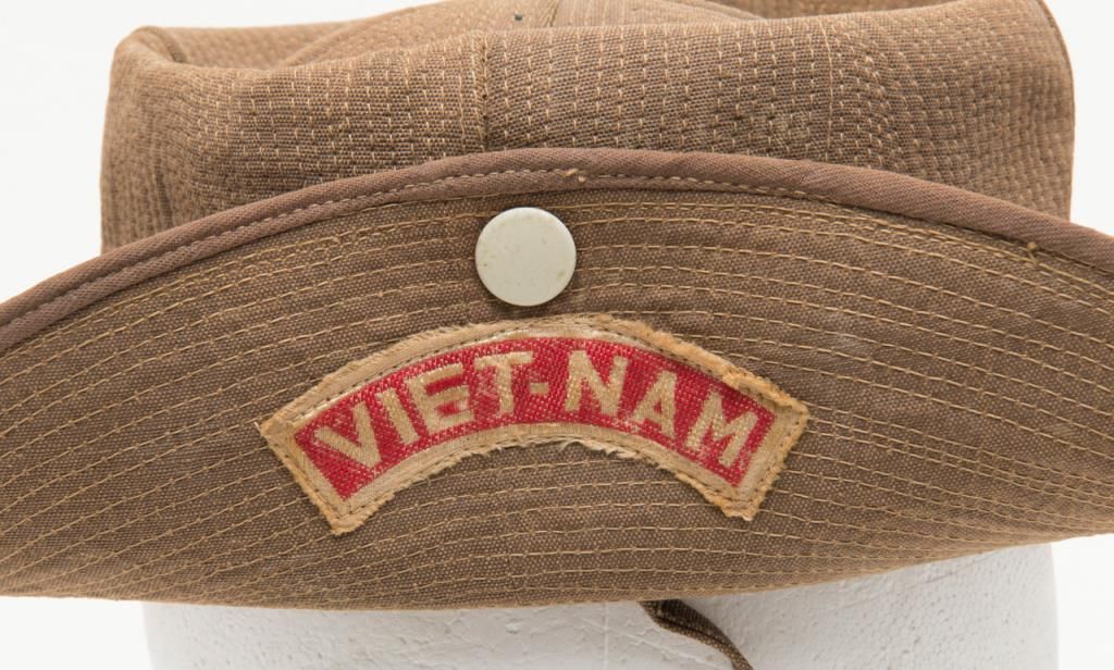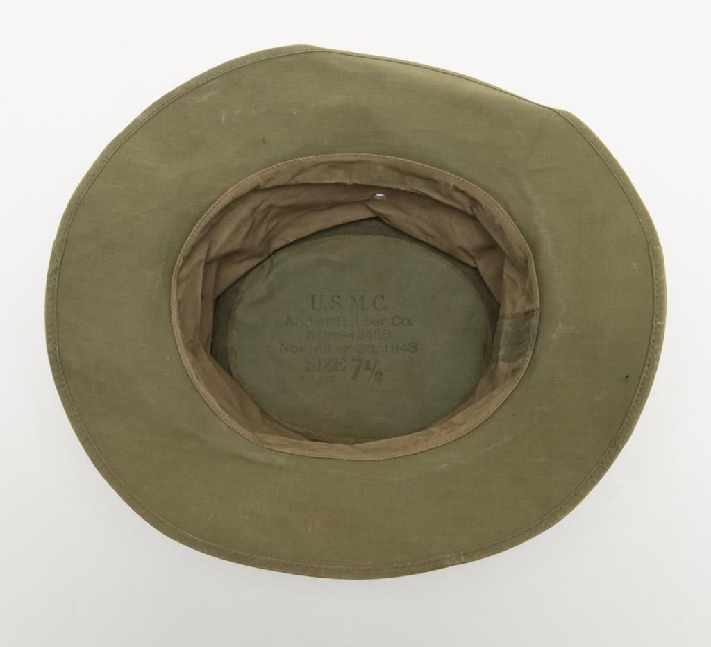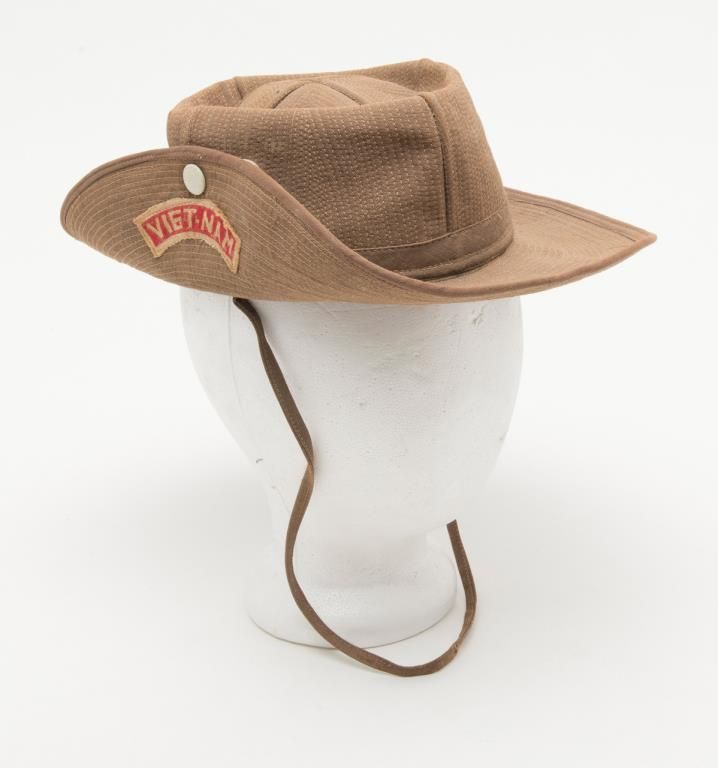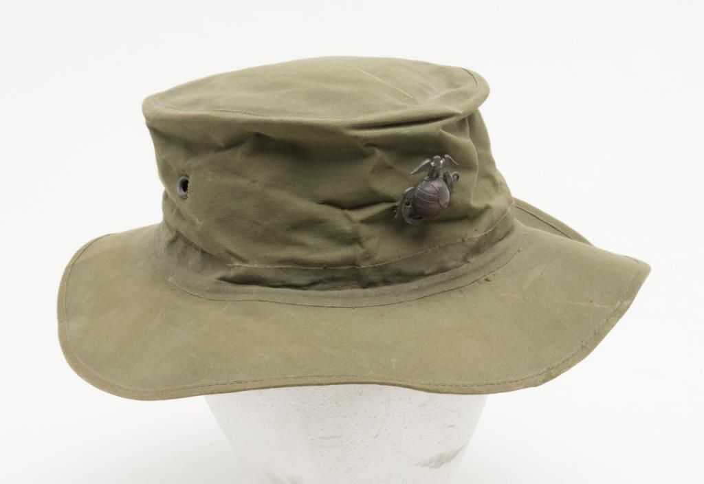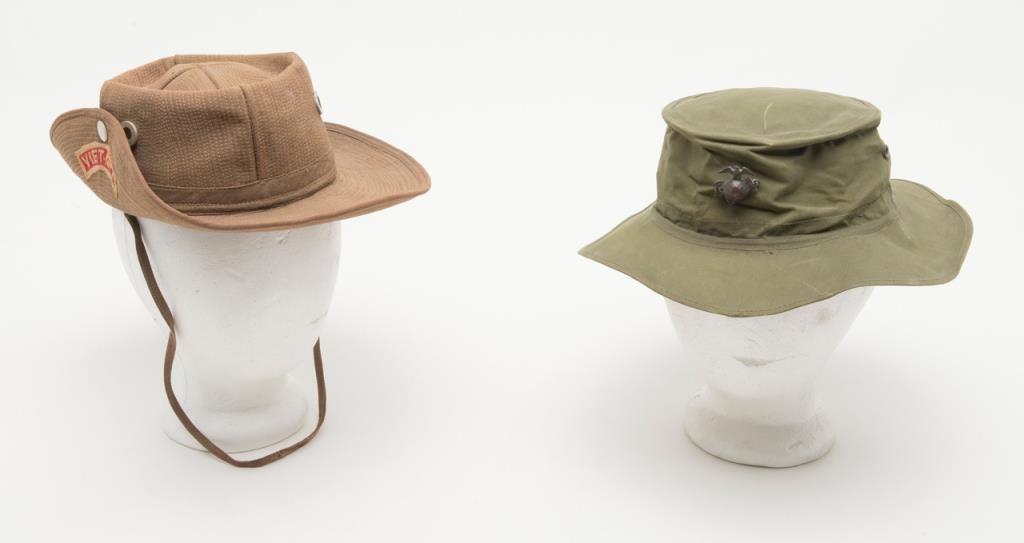 Lot of 2 military hats as described. One Vietnam era hat with patch for South Vietnamese forces in very good condition retaining chinstrap and sweatband. Along with U.S.M.C. marked slouch type hat made by Archer Rubber Company, November 30,1943 dated. Size 7 1/8” with Marine Corps emblem in fair to good condition. Est.: $150-$300