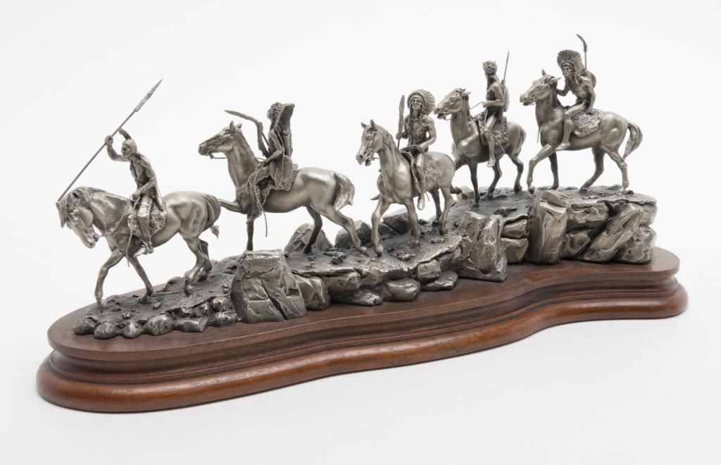 Lot of 2 mini pewter sculptures on wood bases, first of a war party of 5 on horseback, approx. 14” long by 7” in height, by Pollani, dated 6-1-81; second is a limited edition (673/950) of a scouting party, approx. 7” long by 6” in height,also by Pollani, dated 1990. Est.: $175-$350.