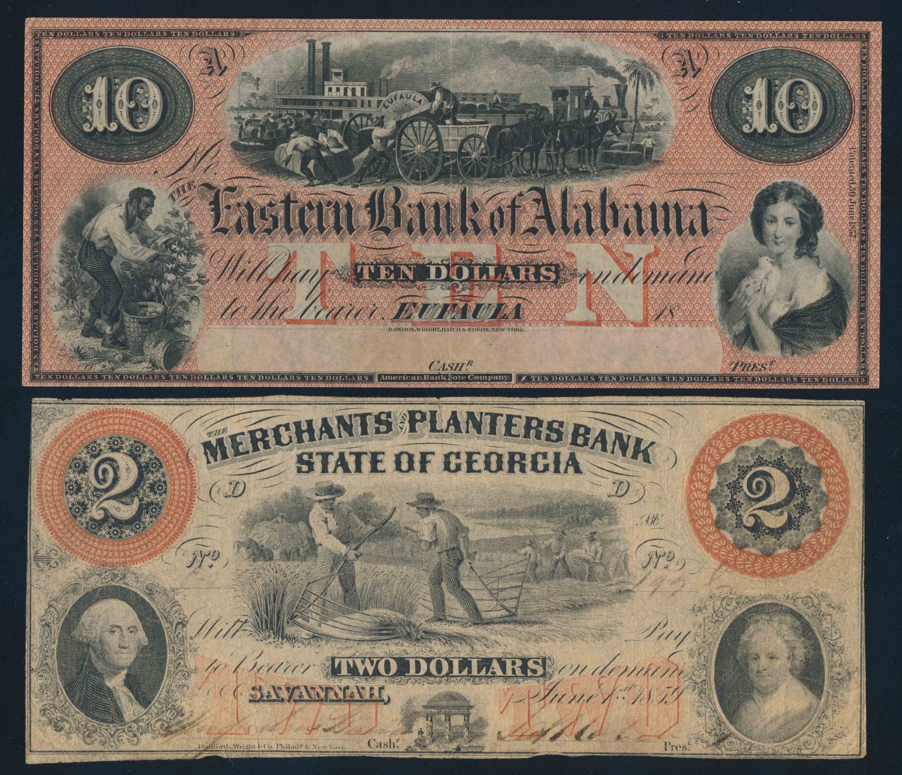 Eastern Bank of Alabama, Eufalia $10 Remainder 18-- Nice EF + Merchants and Planters Bank State of Georgia 1859 VF Issued Note VF Lot of 2 notes