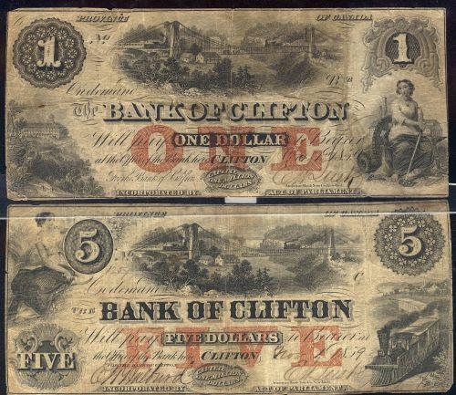 Lot of 2 notes. The Bank of Clifton 1859 $1 and $5 notes. CH-125-10-04-02 and 10-02-06. Both notes are F or better.