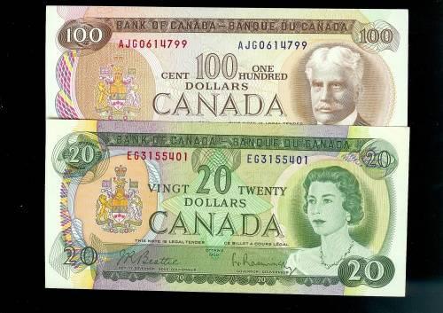 Lot of 2 notes including BC-50a 1969 $20 Beattie-Rasminski and 1975 $100 Crow-Bouey both notes are uncirculated.