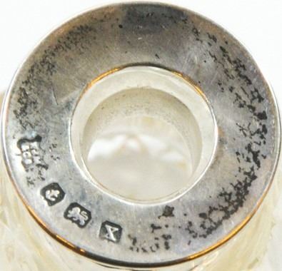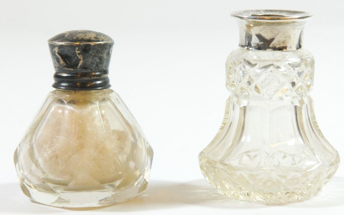 Lot of 2 old glass items combining silver: 1. Antique English perfume bottle, polished crystal with 925 sterling silver on top, signed, missing cork/stopper, height: 6 cm, 2. Polished crystal bottle with silver tip, inside is sealed, cannot be opened, silver tip is unsigned: tested silver, height: 5.5 cm.