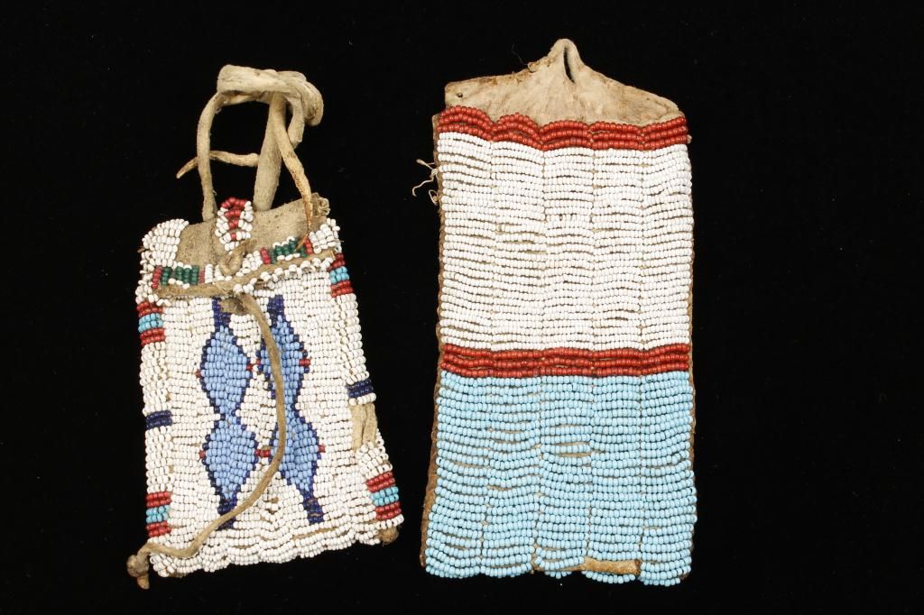 Lot of 2 older beaded Indian strike-a-light small bags including one approx. 3-1/2” X 2-1/4” with a flap cover and multi-color seed beads in overall good condition; another approx. 5” x 2-3/4” with seed beads on bothsides in red, white and blue lazy stitch; some separation of stitching on one side of bag. Est.: $250-$500.