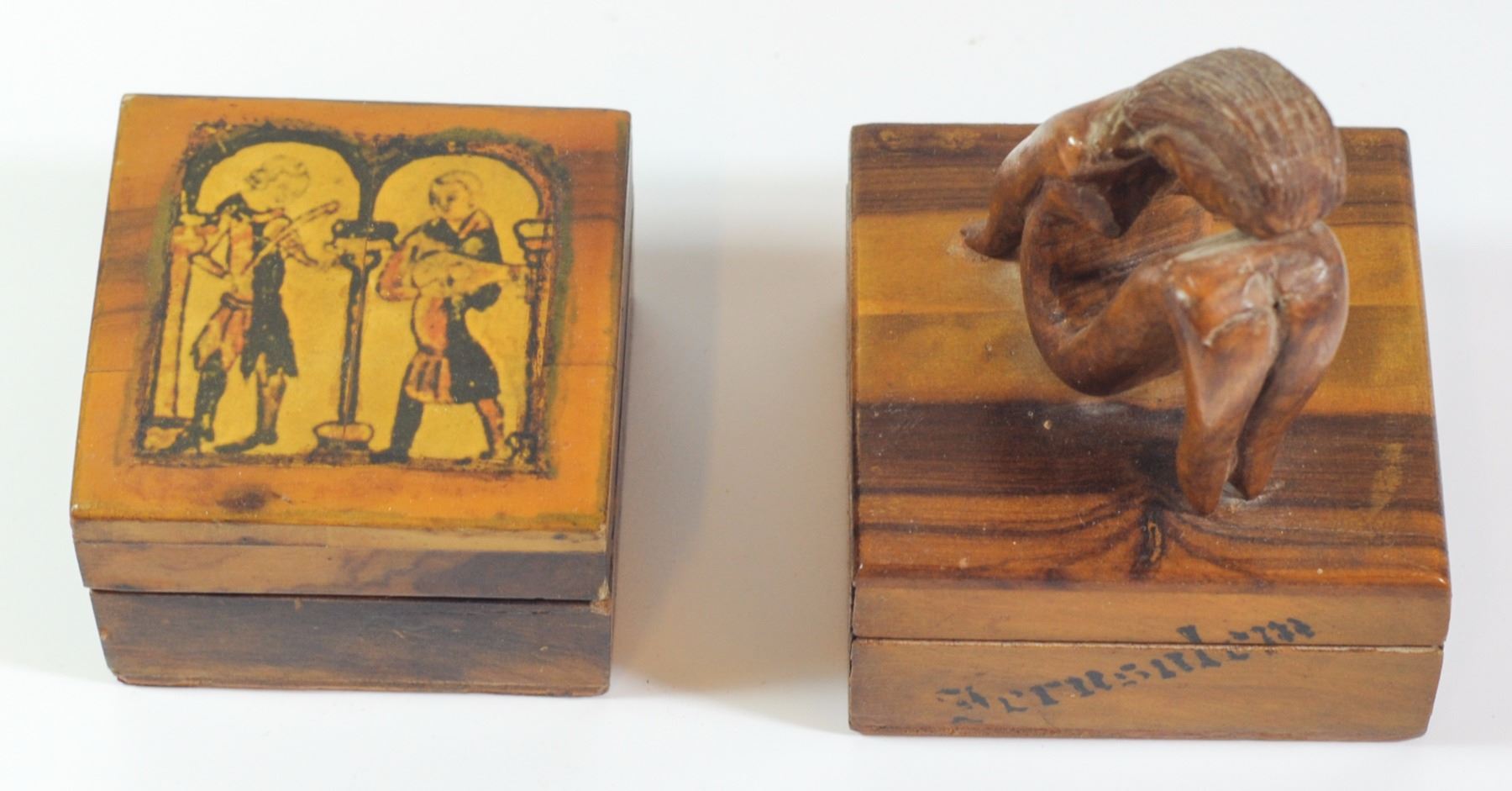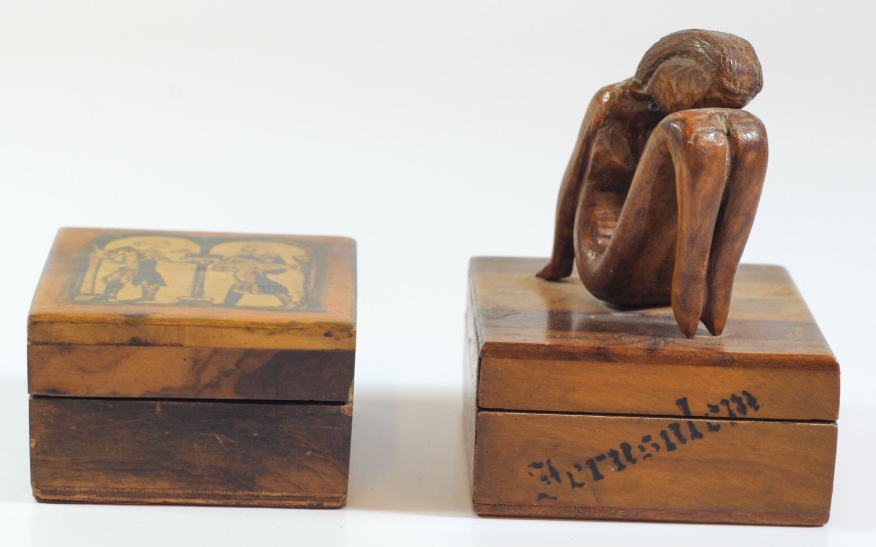 Lot of 2 olive wood boxes: 1. Decorated with a naked woman figure on lid, dimensions:  7X7X10 cm, 2. Decorated with a print of antique handwritting, dimensions:  6.5X6X3 cm.