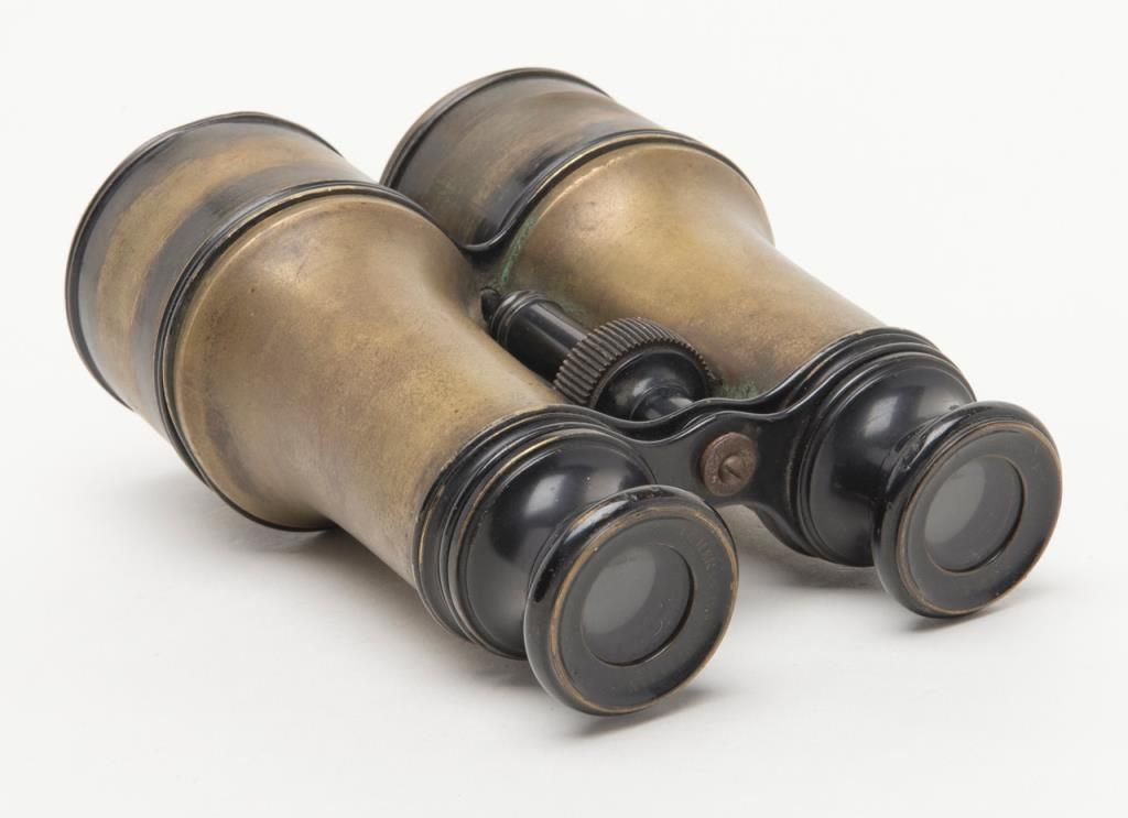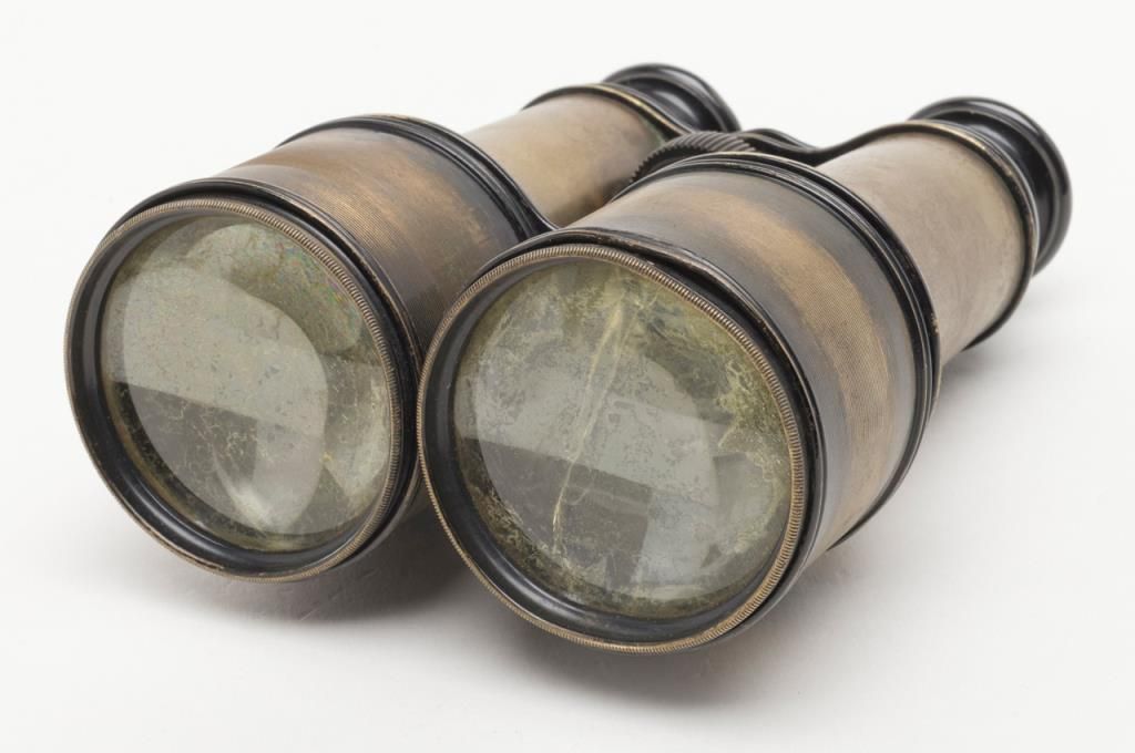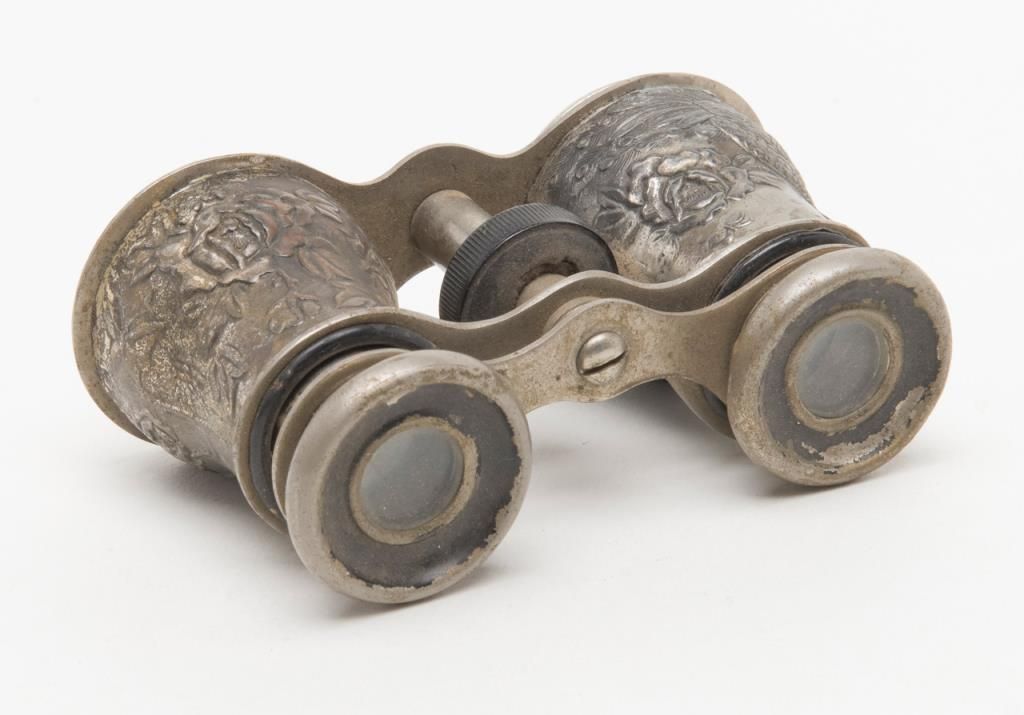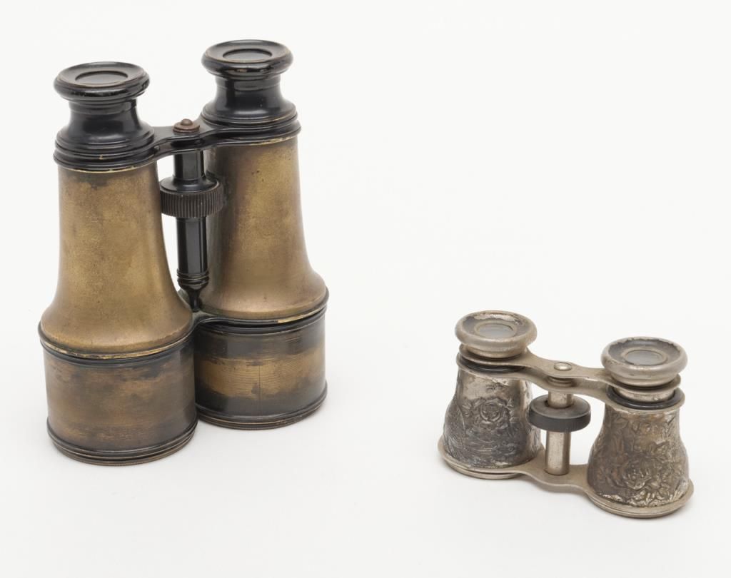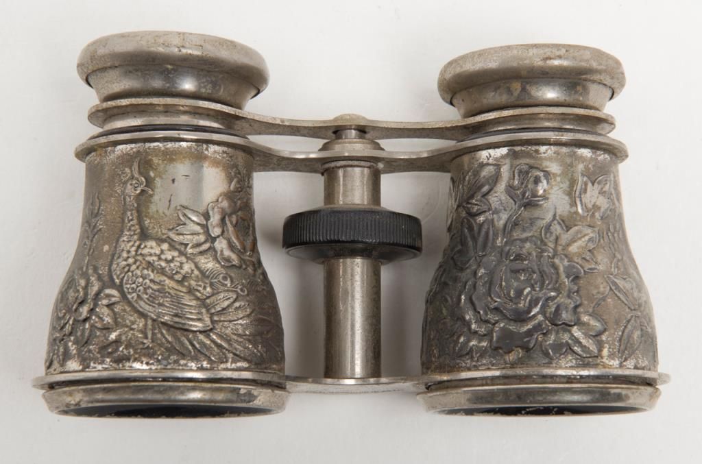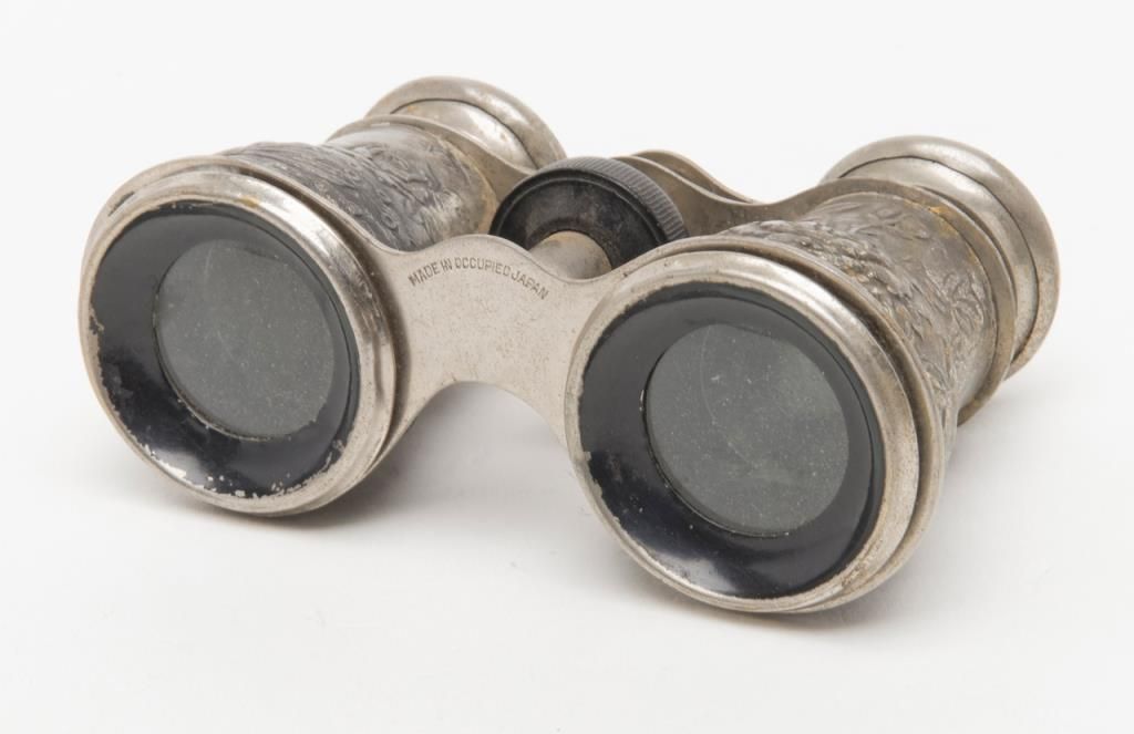 Lot of 2 pair of old binoculars; one is of Civil War vintage, approx. 7” in length with a brass body and damaged lenses; the other a diminutive pair, approx. 2-1/2” in length with raised floral and bird scenes and good optics, stamped “MADE INOCCUPIED JAPAN”. Est.: $100-$200.