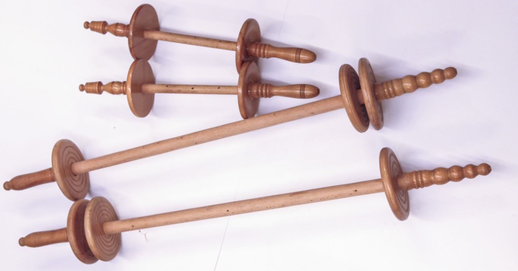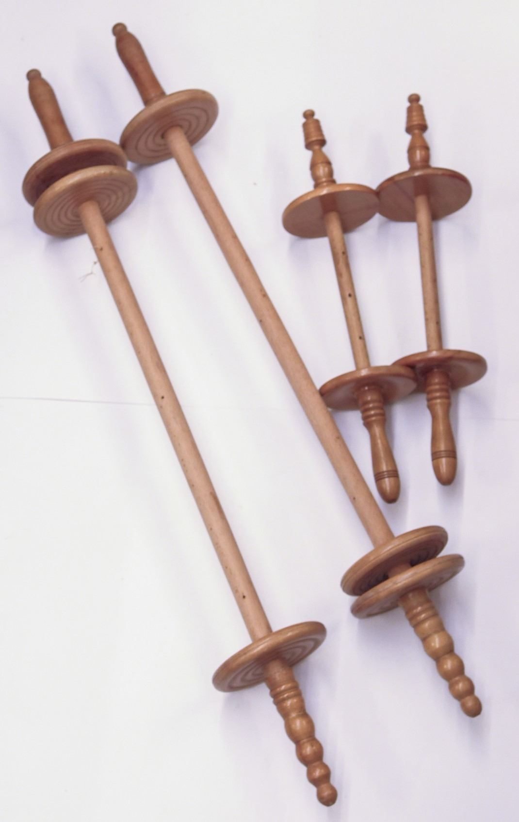 Lot of 2 pairs of Torah book ornaments, circa mid 20th century, made of carved wood, in very good condition, length: larger pair: 95 cm, for Torah book: 56 cm, smaller pair: length: 53 cm, for Torah book: 22.5 cm.