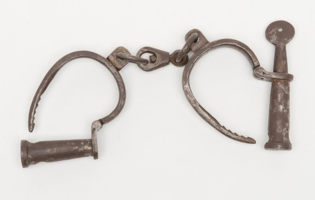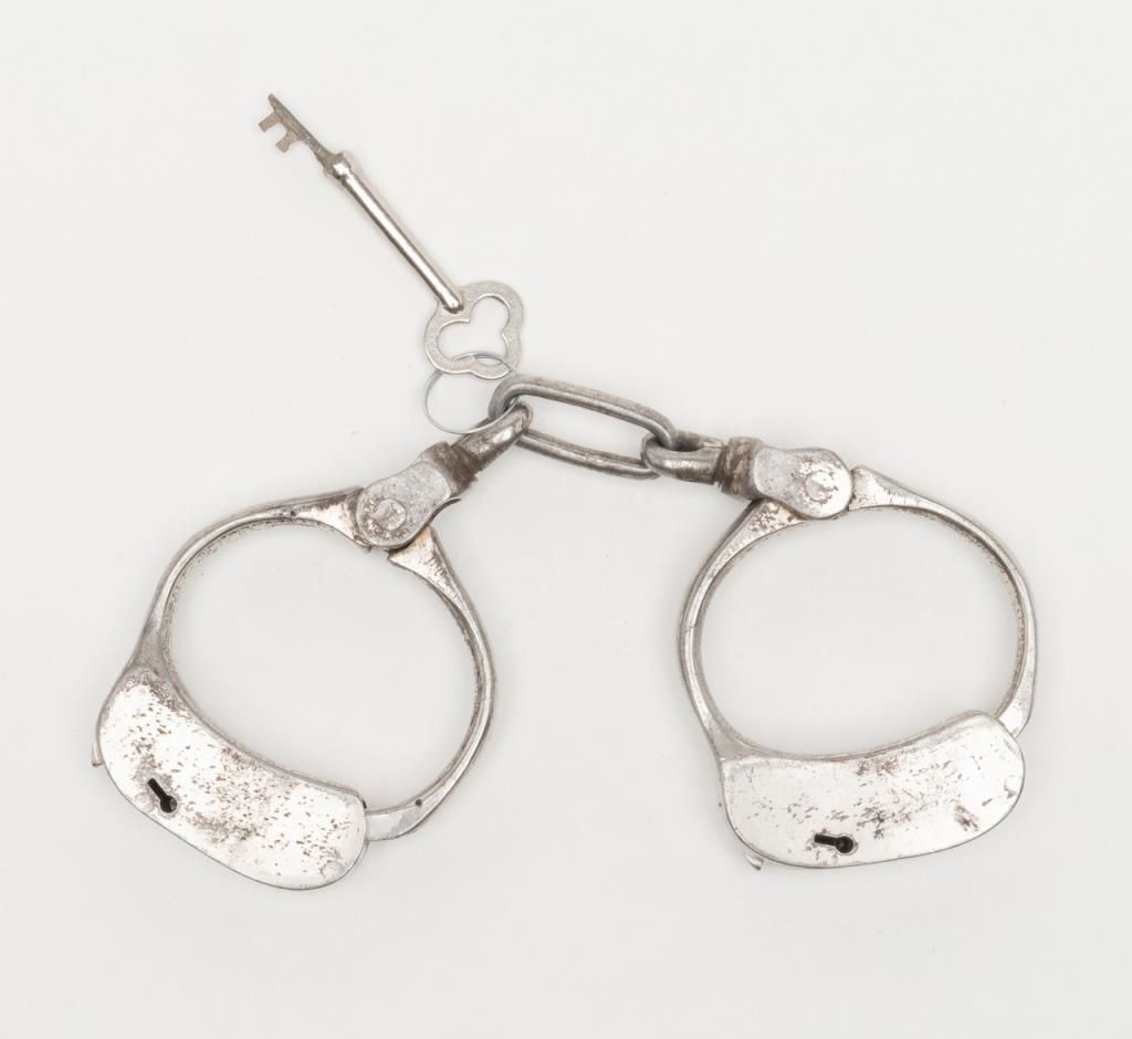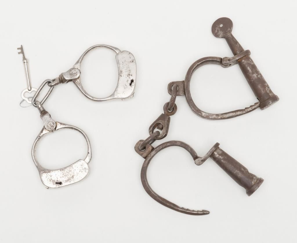 Lot of 2 pairs of handcuffs, both with keys and both working at time of description; one pair is in the style of the mid-1800’s; the other is circa late 1800’s; both show not maker marks or patent dates. Est.: $100-$200.
