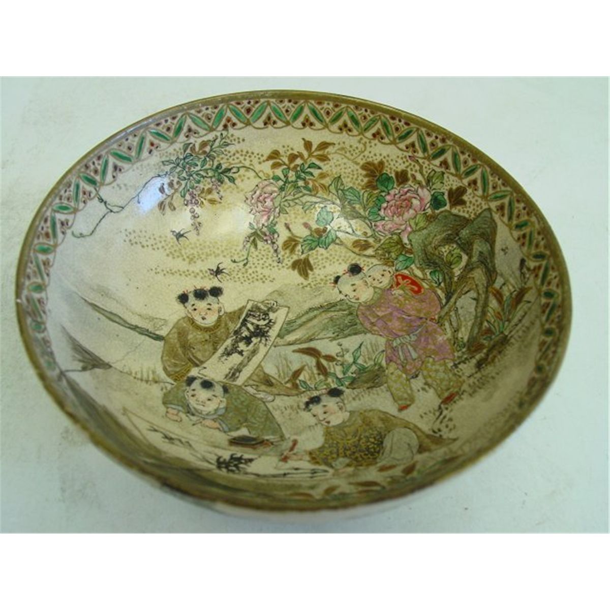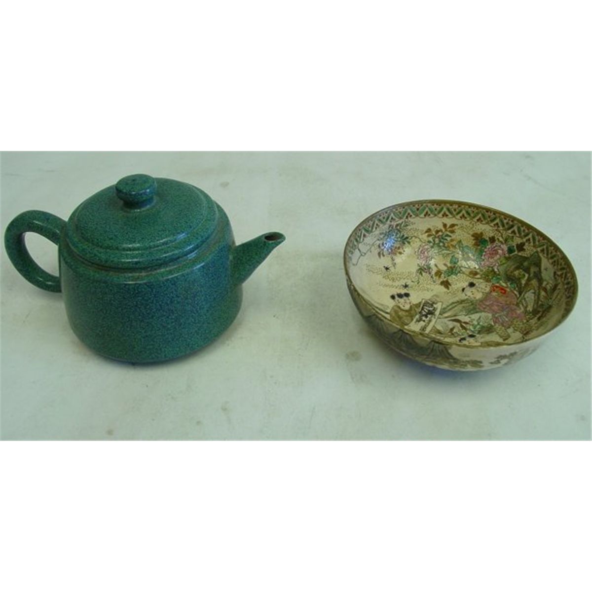 1- Porcelain bowl depicting "Children", cracked. 1- Tea dust teapot. Please read our terms of sale.