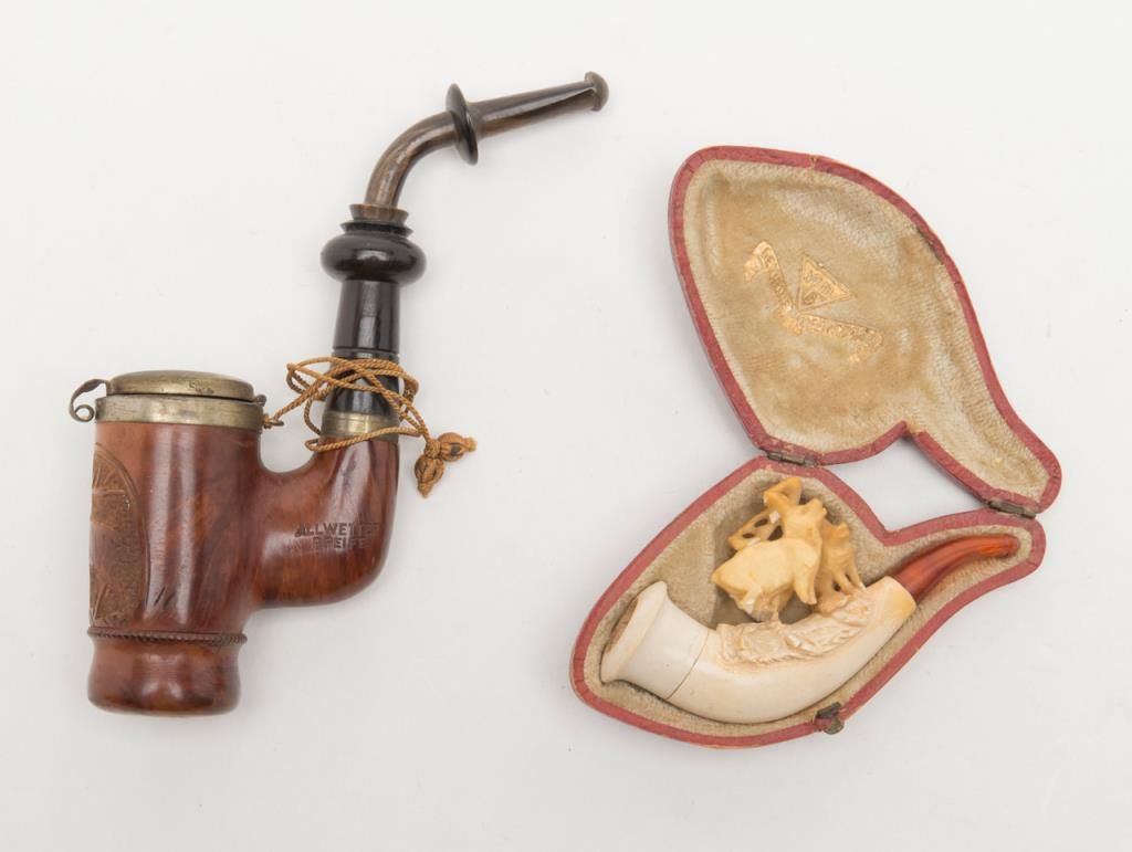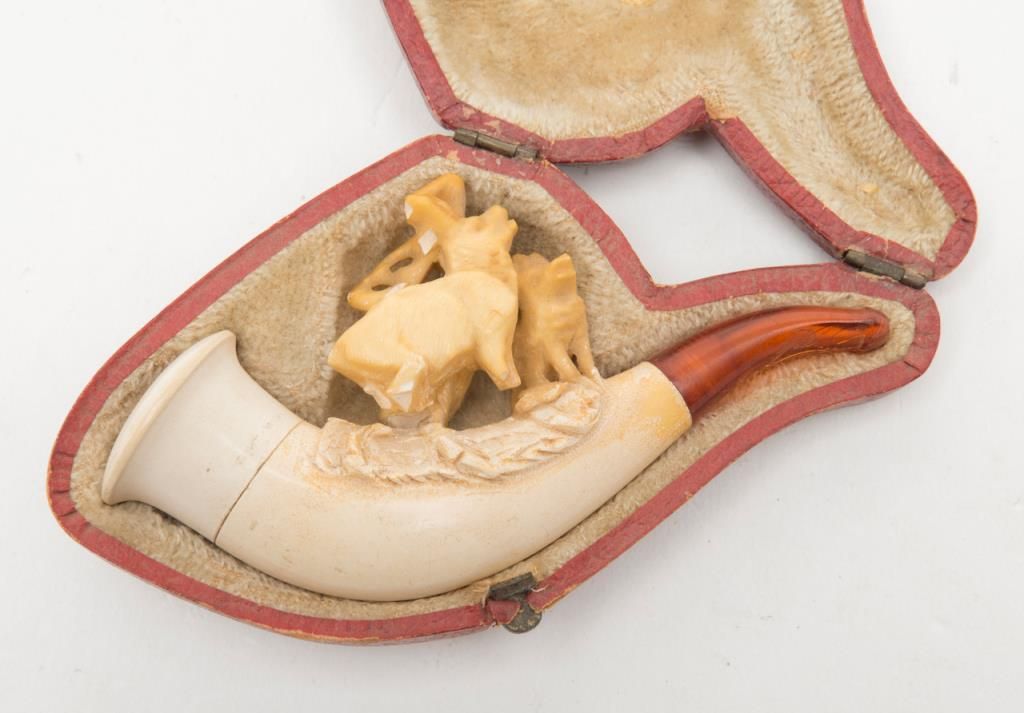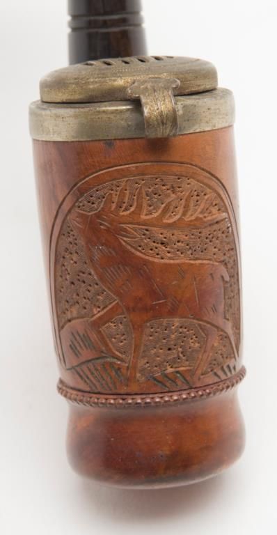 Lot of 2 pipes; one Meerschaum with carved reindeer in a case, some damage needing repair, the other, a carved wooden pipe with metal bowl cover in overall good condition; from a German immigrant’s collection. Est.: $75-$125.
