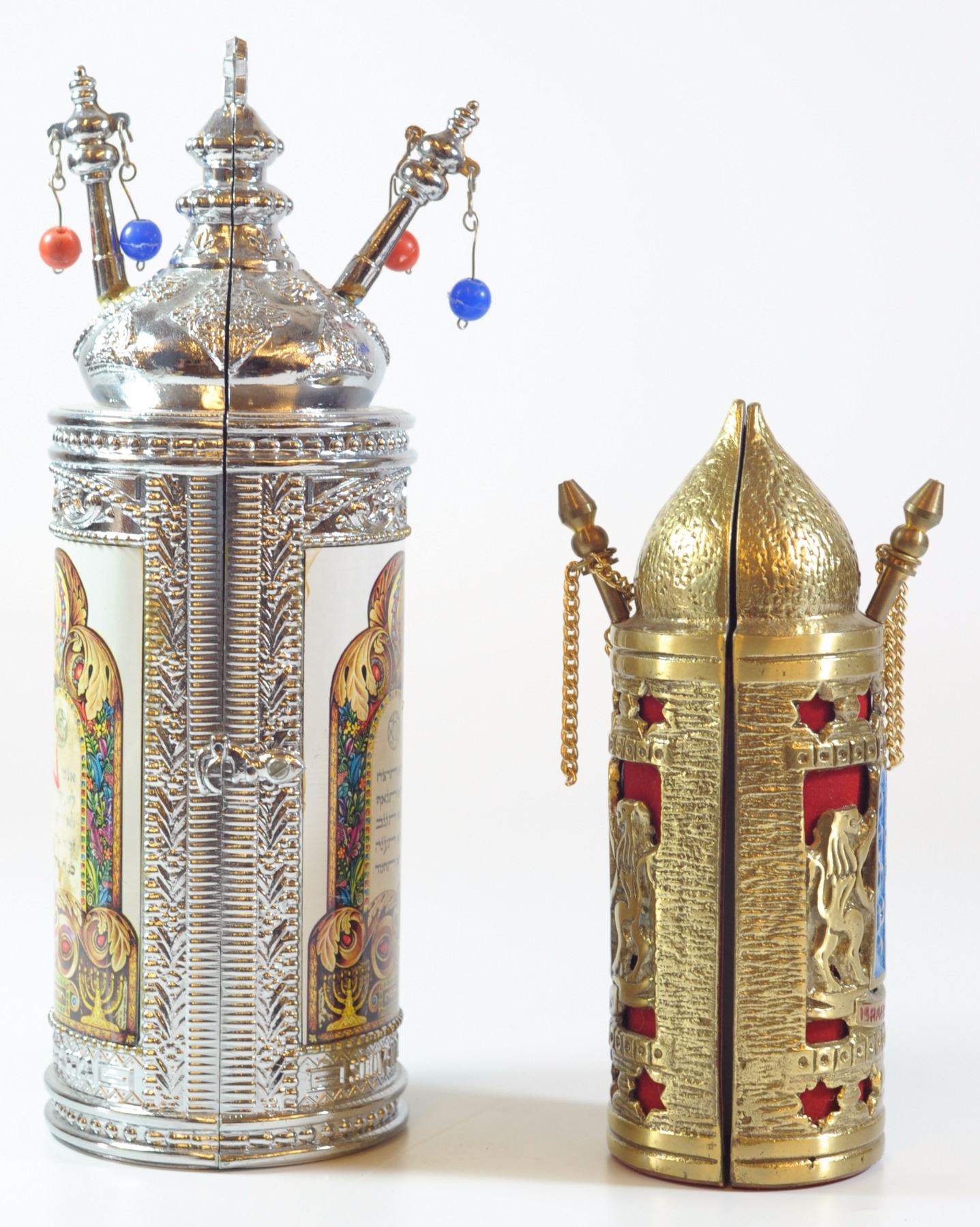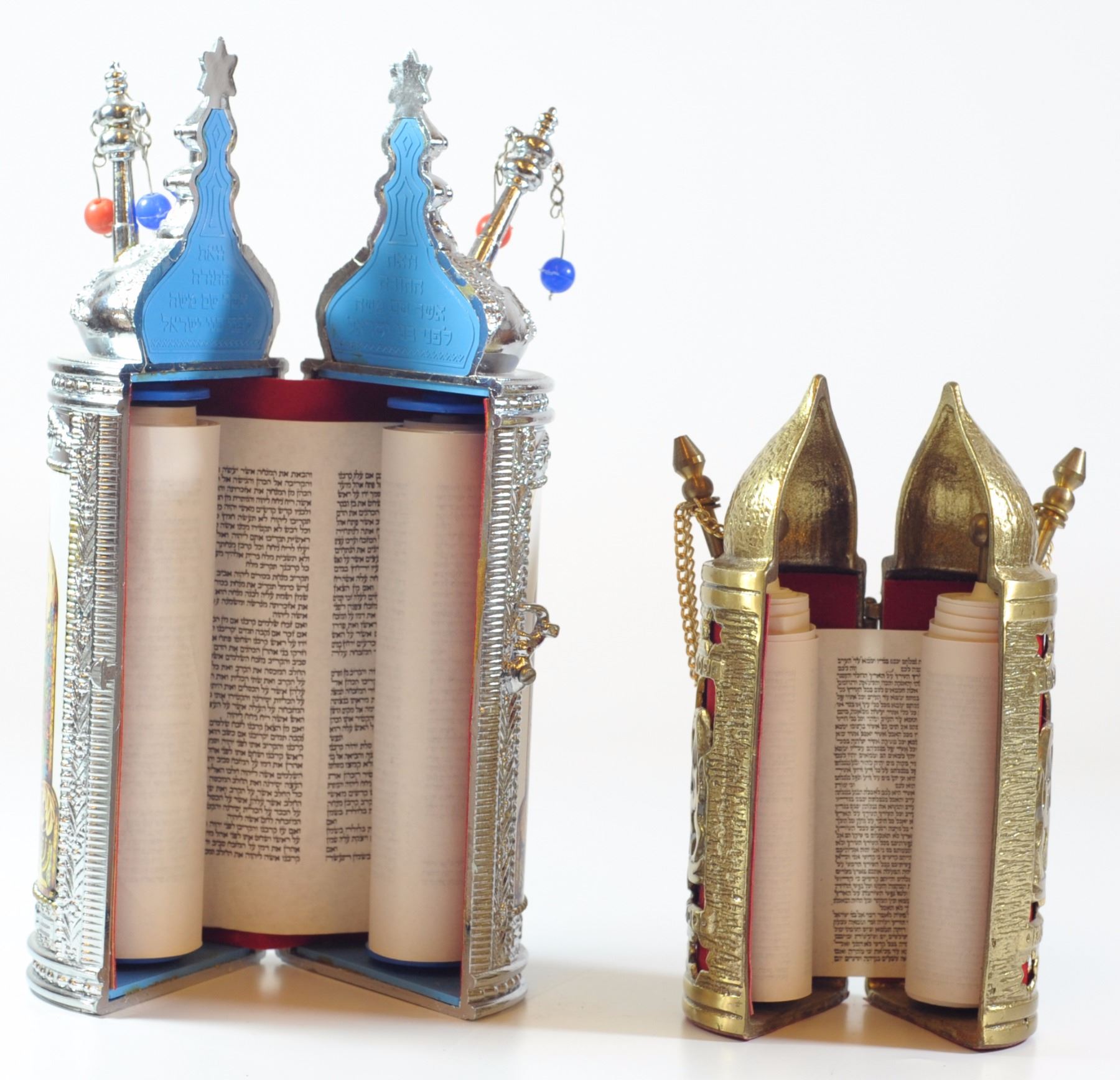 Lot of 2 printed Torah books for children, in the shape of small Torah books, one is made of brass and the other of plastic, height: 17-26 cm.