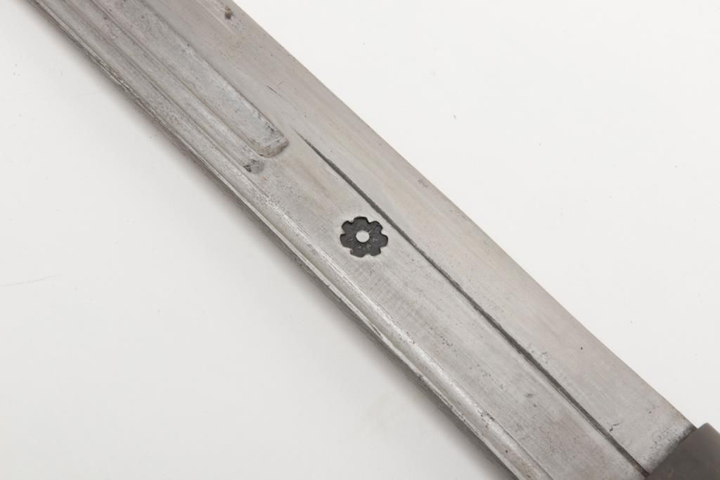 Lot of 2 short swords with scabbards including an un-marked piece with integral brass guard/grip, approx. 29-1/2” overall with black leather scabbard and hanger and an un-marked wide blade piece with decorated horn grip and leather covered wood scabbard, approx. 31-1/4” overall and in good to very good condition. Est.: $300-$500.