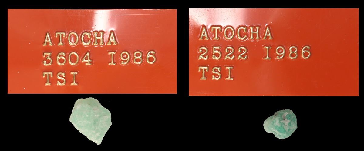 Lot of 2 small, natural emeralds, 1.57 and 1.16 carats, both with original plastic tags but only one with original certificate. About 1/2" and 1/4". Both opaque and light in color (the larger one lighter), albeit desirable in size and shape (not just fragile chips). With original Fisher tags #2522 (and certificate) and 3604, both also pedigreed to the Ponterio auction of October 1991, with original lot-tags #598 and 599. Recovered from: Atocha, sunk in 1622 west of Key West, Florida