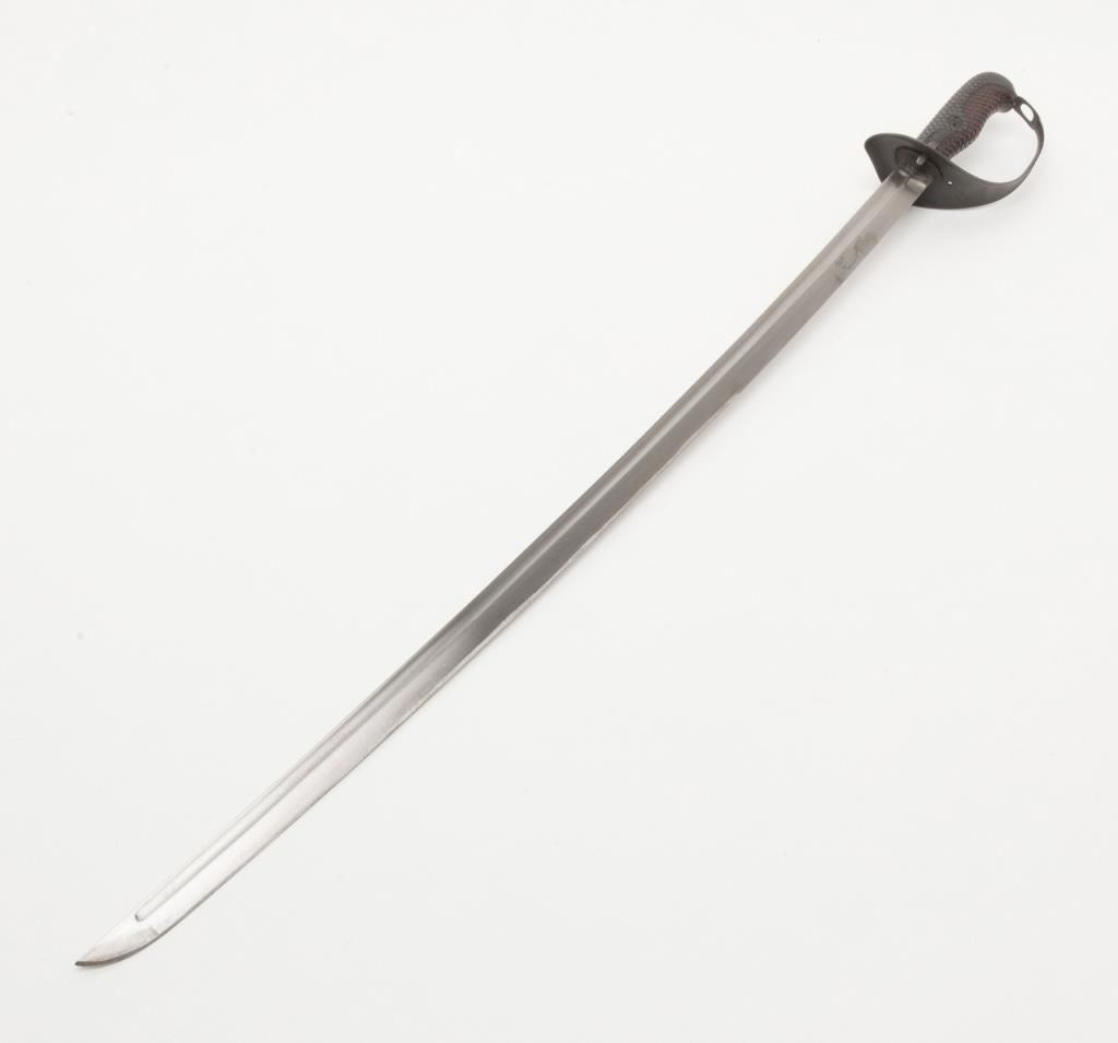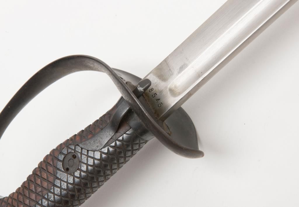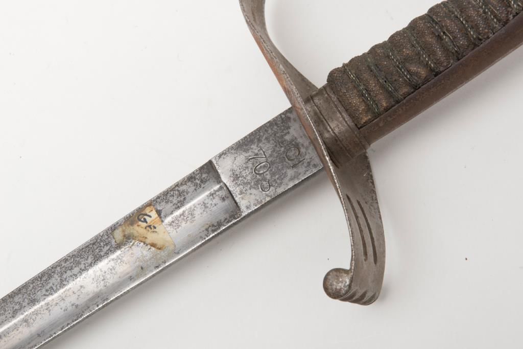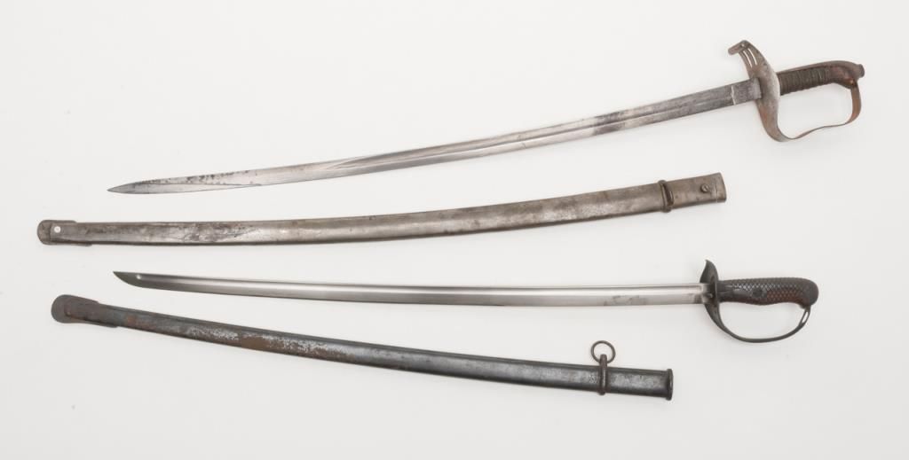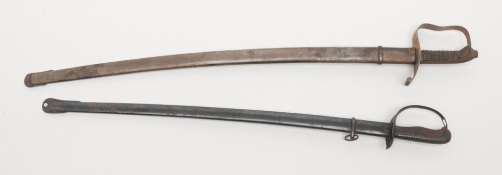 Lot of 2 swords/scabbards consisting of a semi-curved blade by Eyersbepo & Co., Solingen with metal scabbard, approx. 41” overall in un-cleaned condition and an un-marked plain blade sword with checkered wood grip and metal scabbard, approx. 36-1/2” overall showing a very good blade and blued scabbard displaying areas of surface rust from storage. Est.: $250-$450.