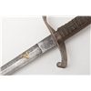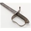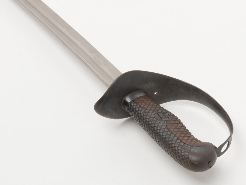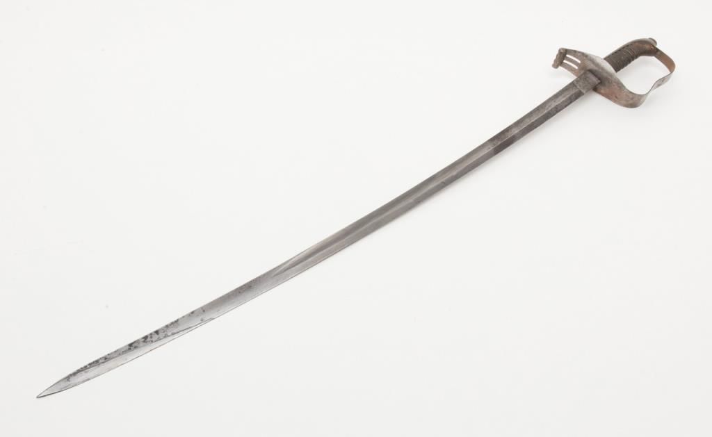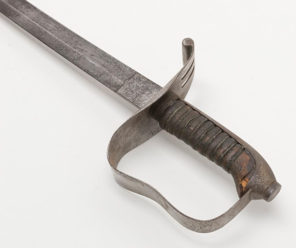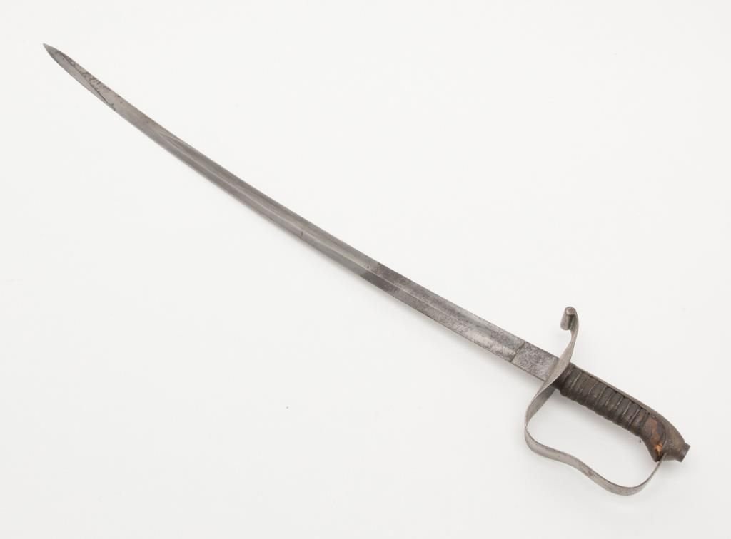 Lot of 2 swords/scabbards consisting of a semi-curved blade by Eyersbepo & Co., Solingen with metal scabbard, approx. 41” overall in un-cleaned condition and an un-marked plain blade sword with checkered wood grip and metal scabbard, approx. 36-1/2” overall showing a very good blade and blued scabbard displaying areas of surface rust from storage. Est.: $250-$450.