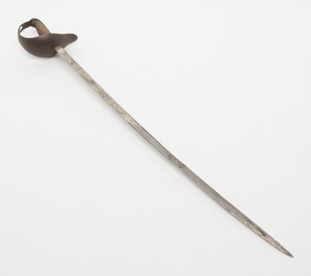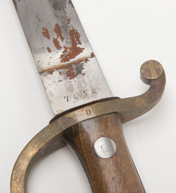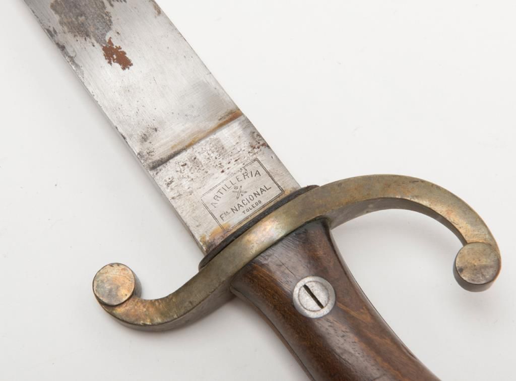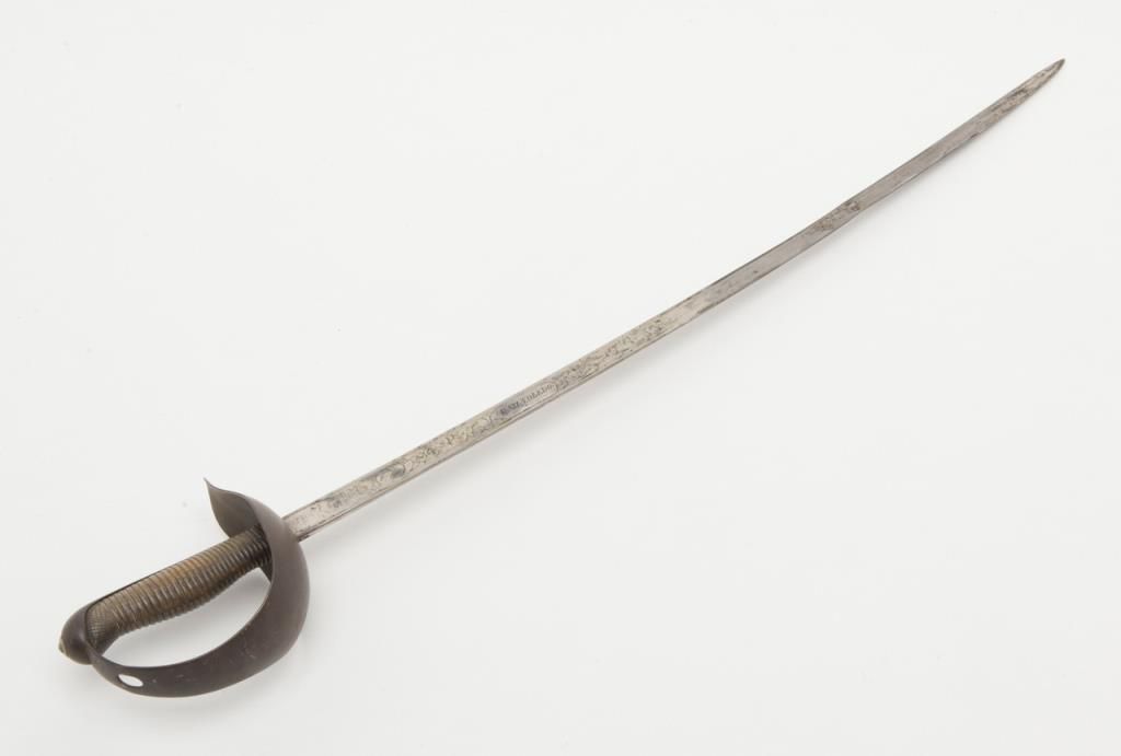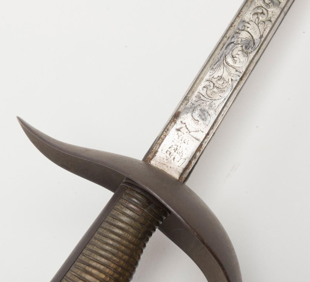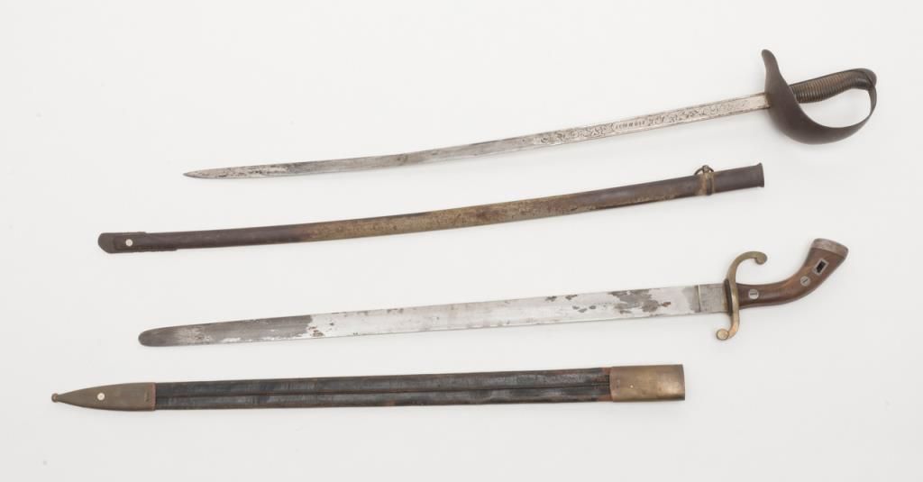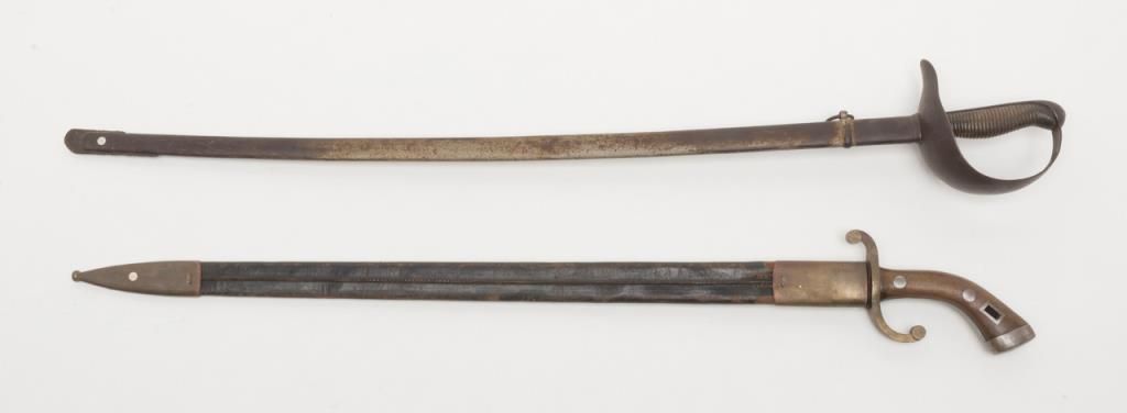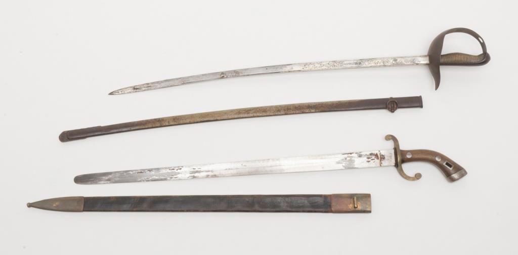 Lot of 2 swords with scabbards, both marked Toledo; first, a D-guard with engraved blade with panel on one side “ANO D 1857” on one side and “PaD-TOLEDO” on the other; horn grip and metal scabbard, approx. 37” overall and in un-cleanedgood condition. The second piece is an Artillery short sword with scabbard, approx. 33-1/2” overall with “S” brass guard, wood grip and leather scabbard displaying brass throat and drag; the blade shows some areas of erosion and the number7054. Est.: $175-$350.