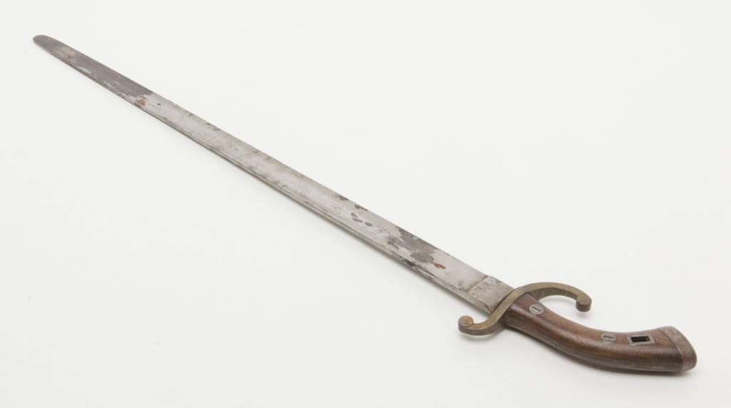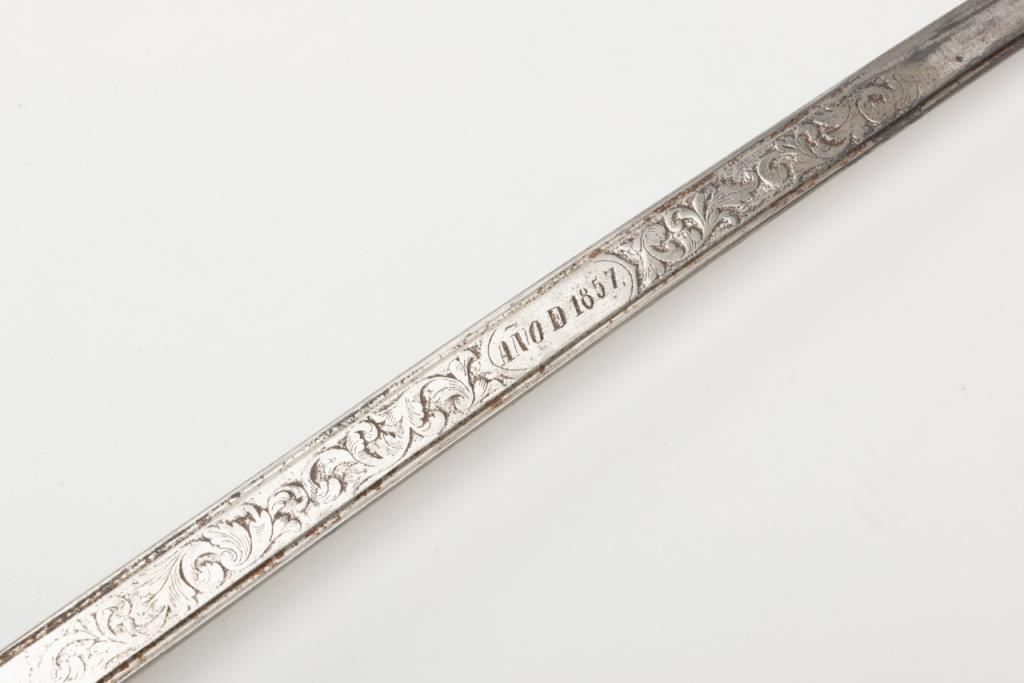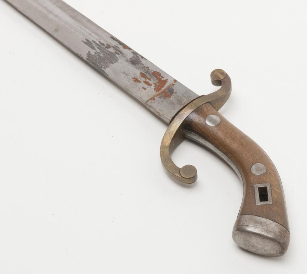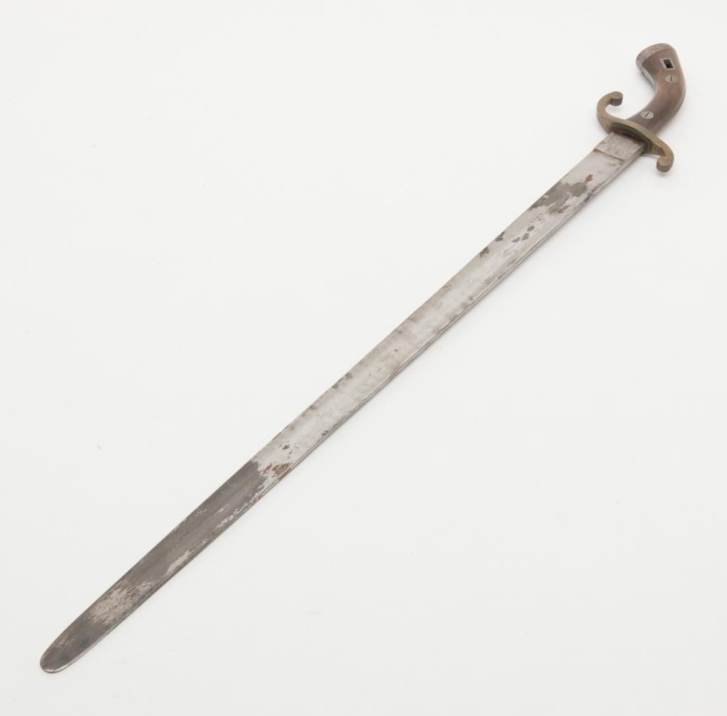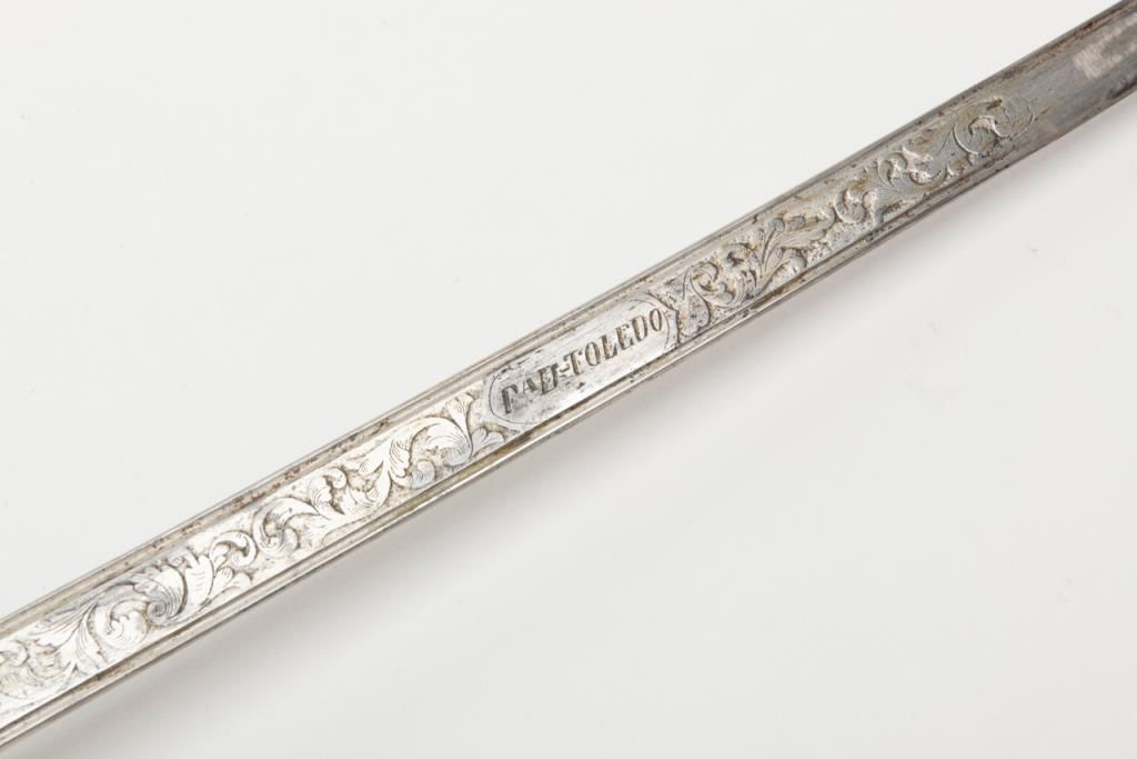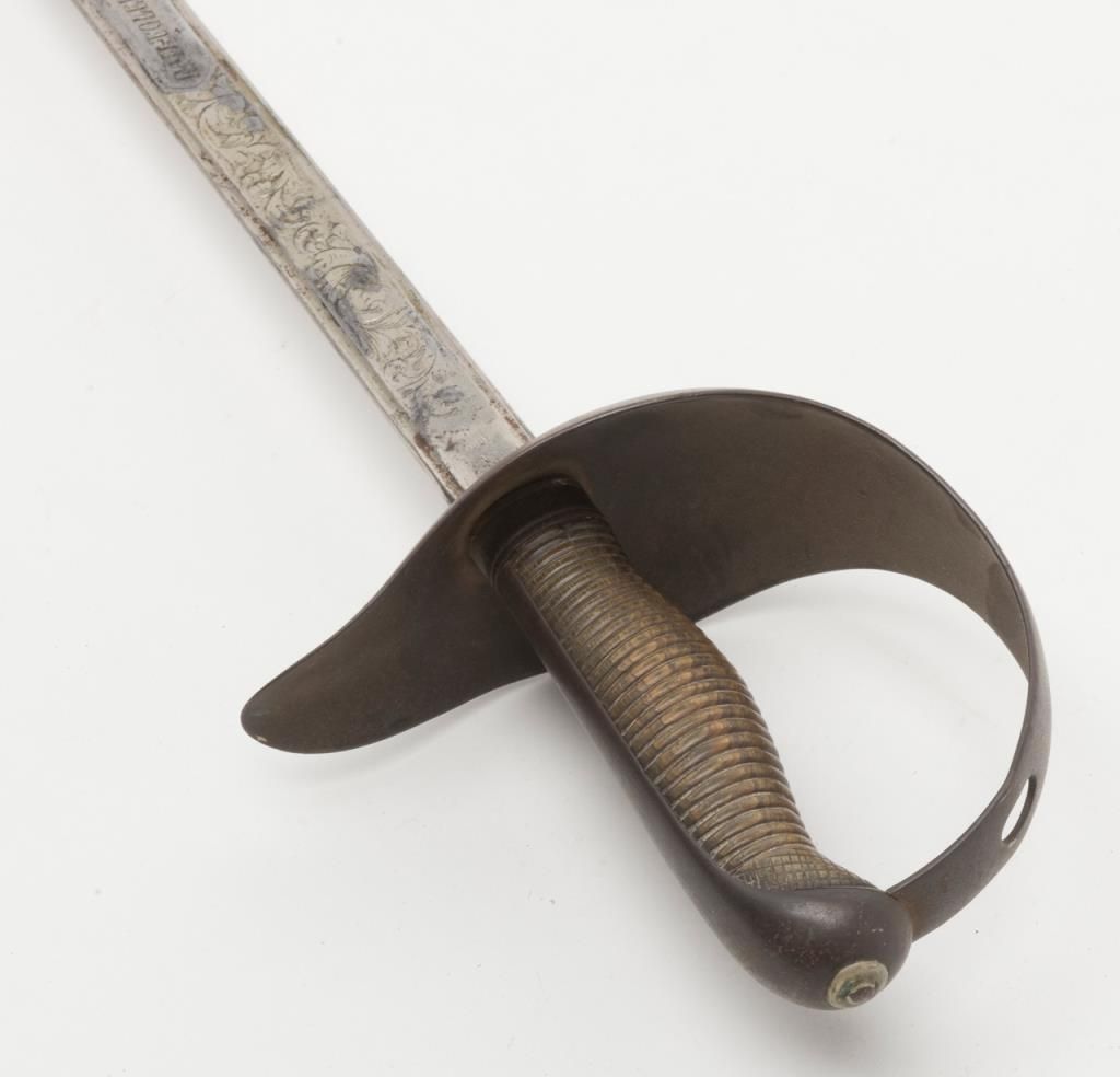 Lot of 2 swords with scabbards, both marked Toledo; first, a D-guard with engraved blade with panel on one side “ANO D 1857” on one side and “PaD-TOLEDO” on the other; horn grip and metal scabbard, approx. 37” overall and in un-cleanedgood condition. The second piece is an Artillery short sword with scabbard, approx. 33-1/2” overall with “S” brass guard, wood grip and leather scabbard displaying brass throat and drag; the blade shows some areas of erosion and the number7054. Est.: $175-$350.