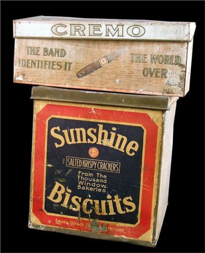 Lot of 2 tins Sunshine Biscuit and Cremo Cigar Tin and 2 "OK" Car License Plates