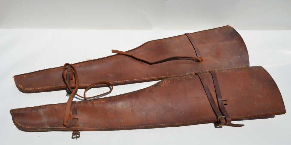 Lot of 2 un-marked leather shotgun scabbards, each approx. 33-1/2” overall and in somewhat dry but good condition; straps show some damage. Est.: $35-$70.
