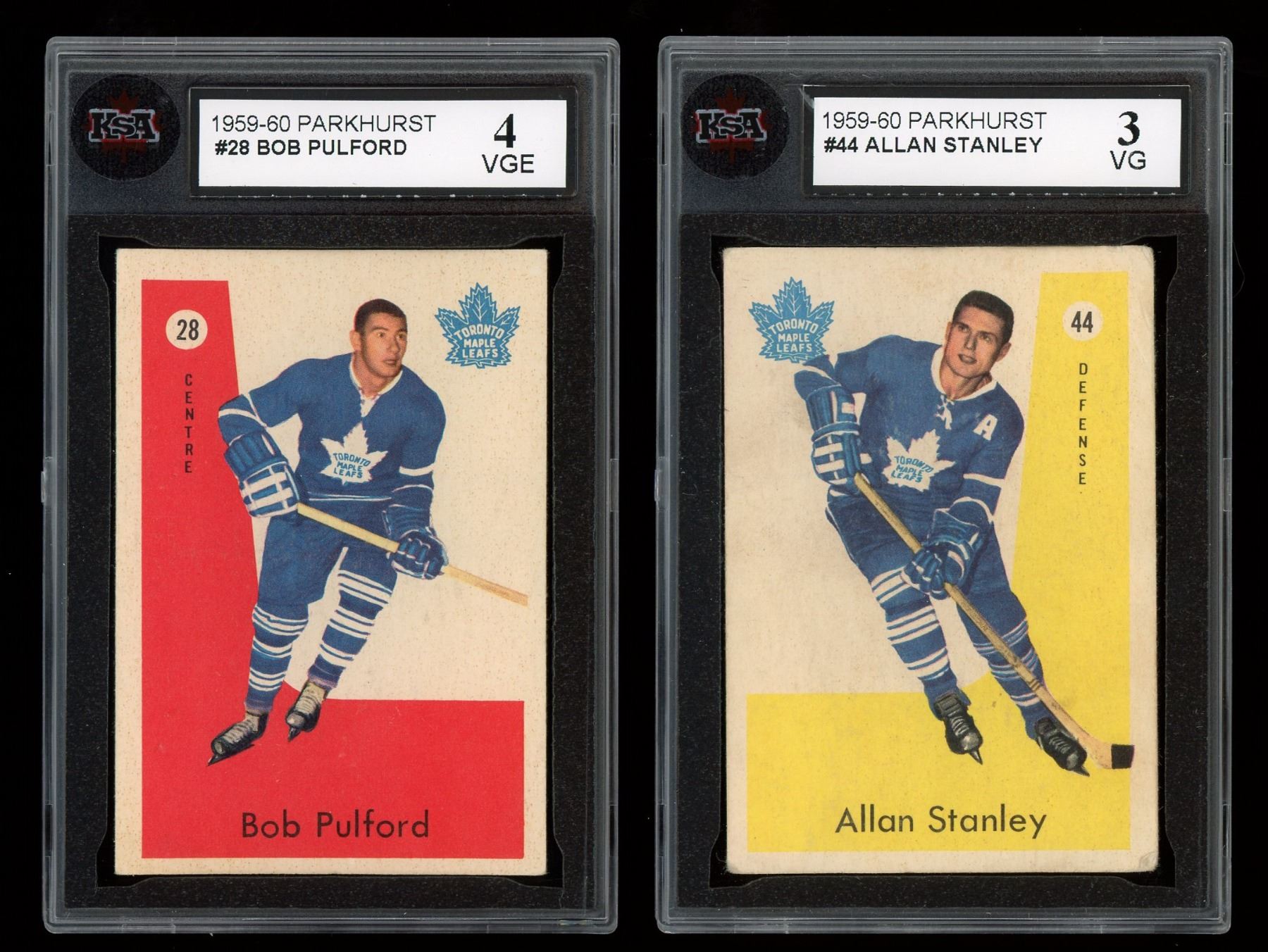 2 Hall of Famers from the 1959-60 Parkhurst hockey set, both KSA graded, includes #28 Bob Pulford (VG-EX 4), and #44 Allan Stanley (VG 3).