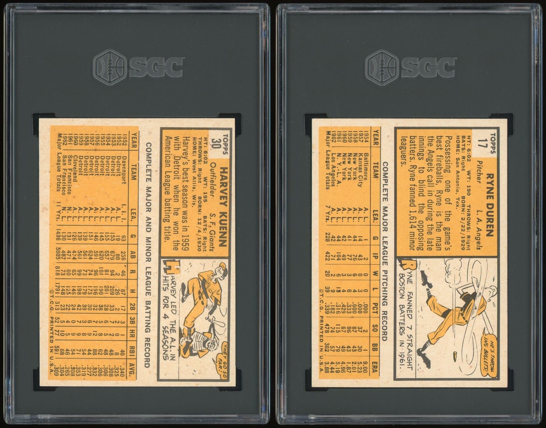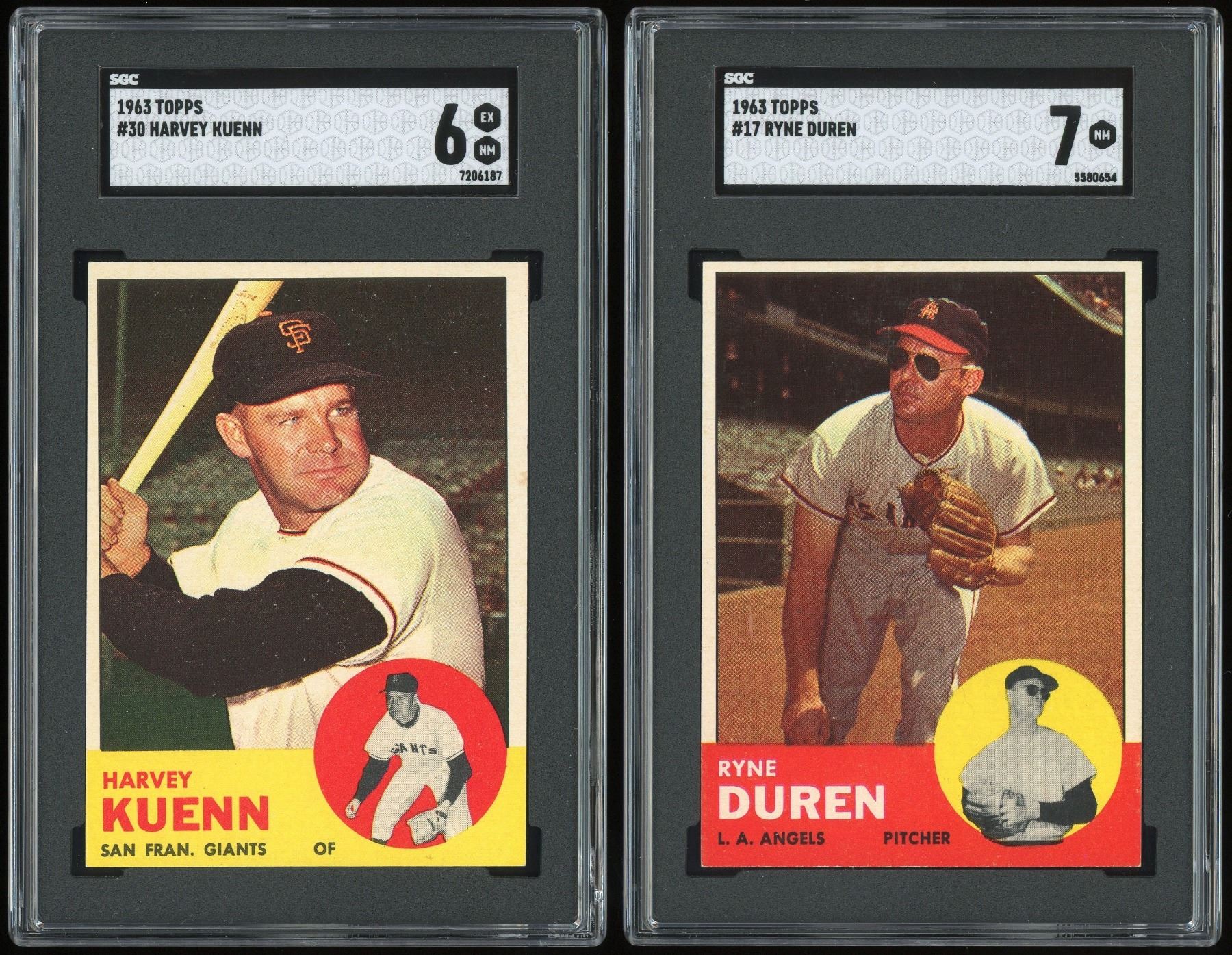 This lot contains a pair of SGC-graded minor stars from the 1963 Topps baseball set, includes #17 Ryne Duren (7 NM) and #30 Kuenn (6 EX-NM). Duren was a fireballing right handed pitcher and Kuenn, a lifetime .303 hitter (2000+ hits) who led the NL in hits 4 times while capturing the 1959 batting title with a lofty .353 batting average.