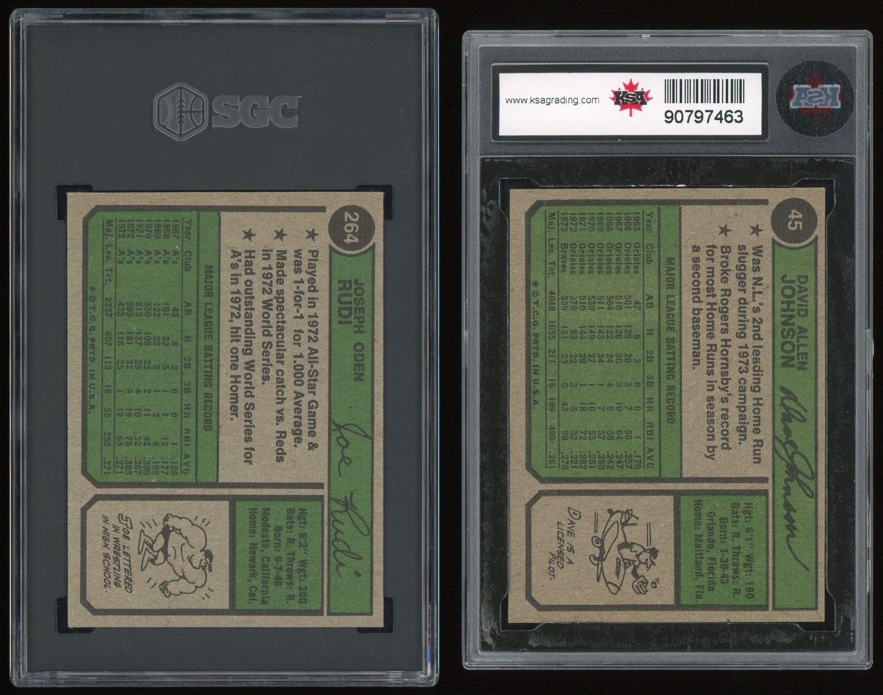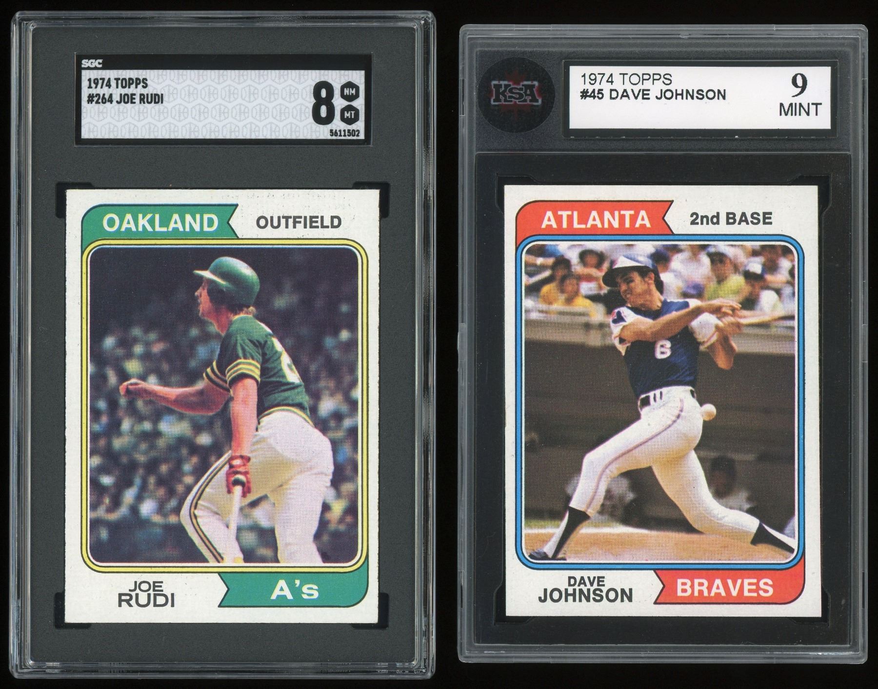 Here are two sluggers of the 70s, both sporting high grades, includes: #45 Dave Johnson (KSA 9 MINT) and #264 Joe Rudi (SGC 8 NM-MT).