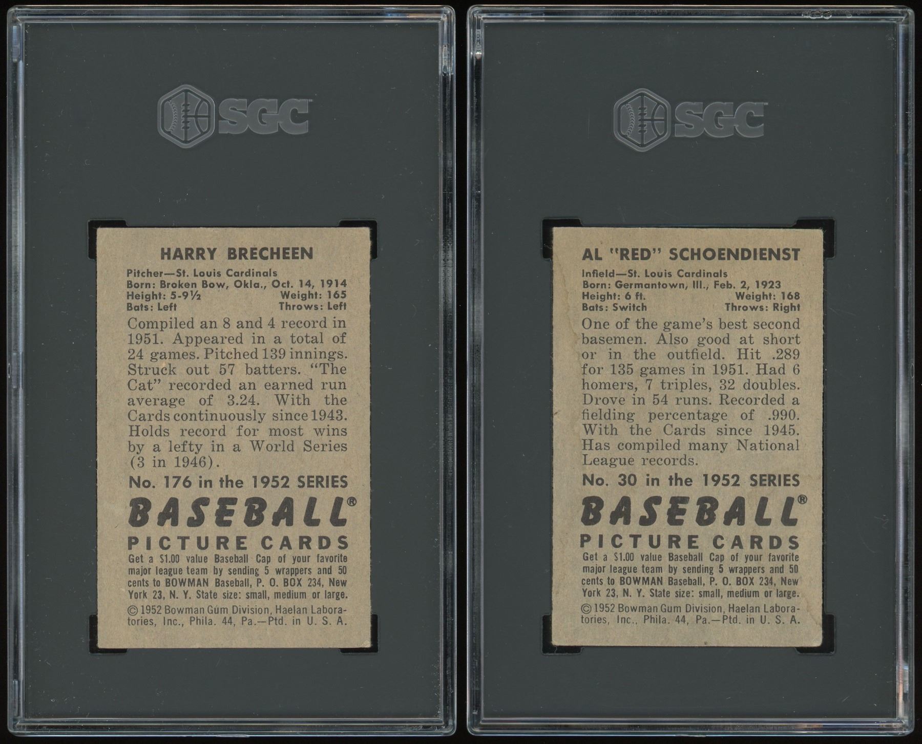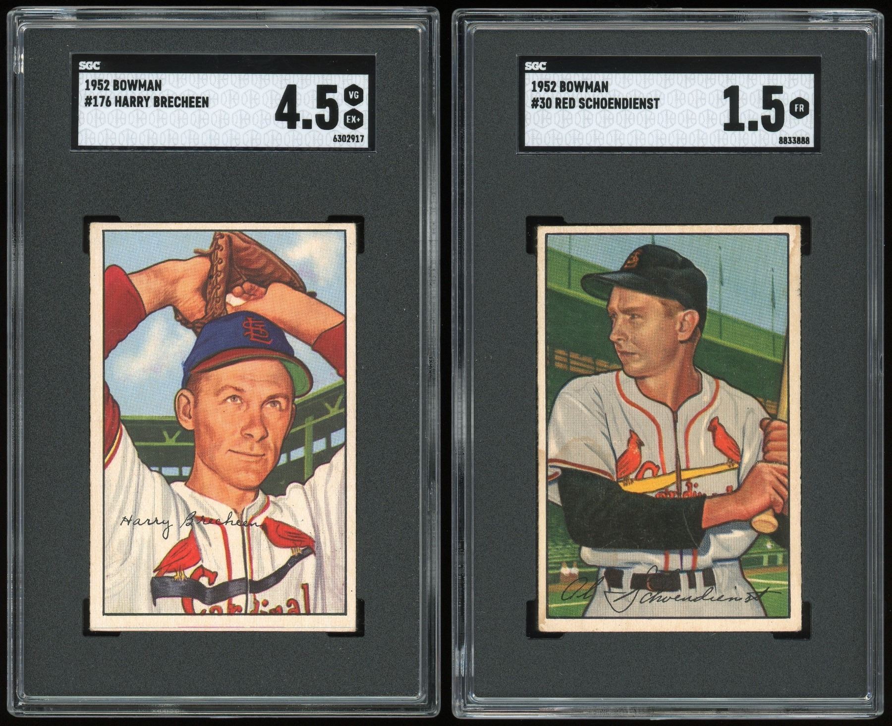 Lot contains two SGC graded cards from the classic 1952 Bowman set, includes St. Louis Cardinal teammates HOFer #30 Red Schoendienst (SGC 1.5 FR) and #176 Harry Brecheen (SGC 4.5 VG-EX+).