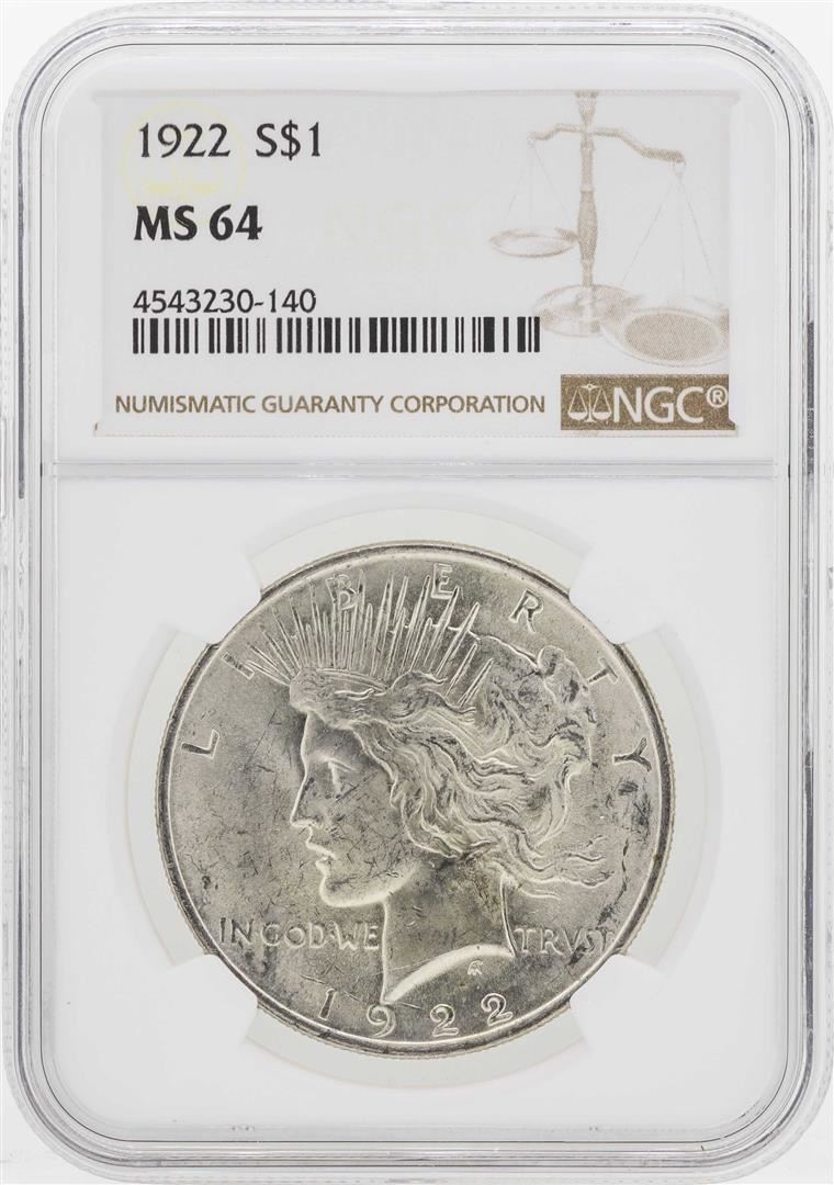 One Lot of (20) 1922 $1 Peace Silver Dollar Coin NGC MS64. NGC Certified.