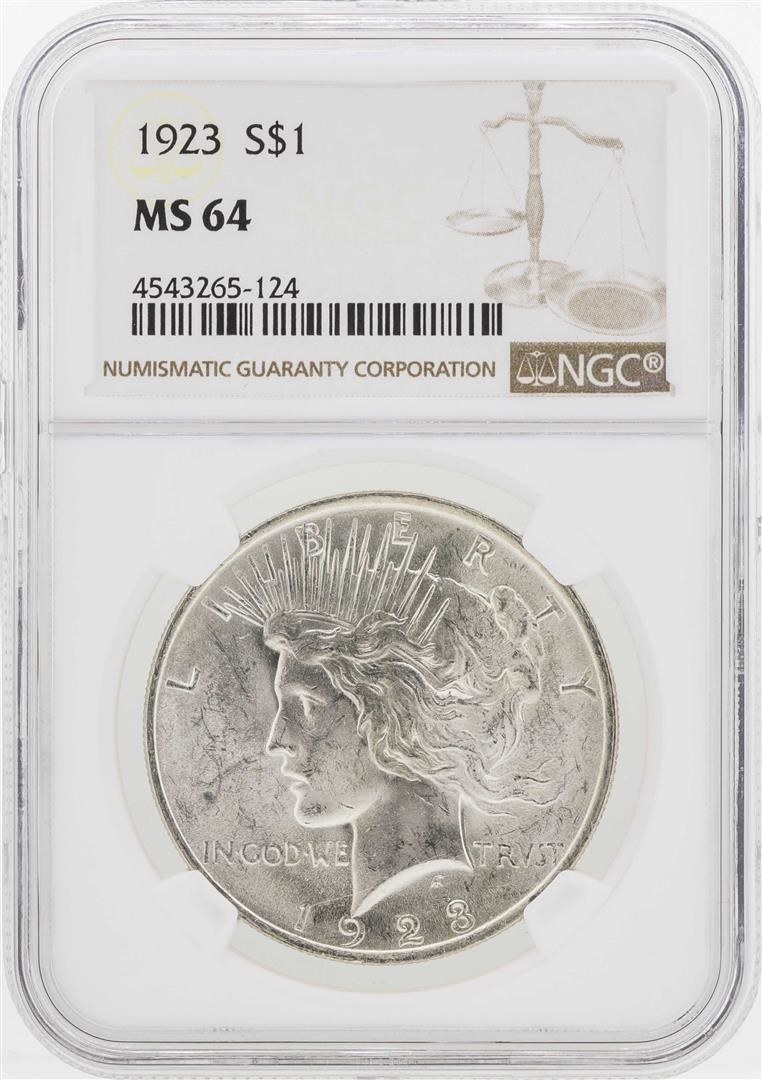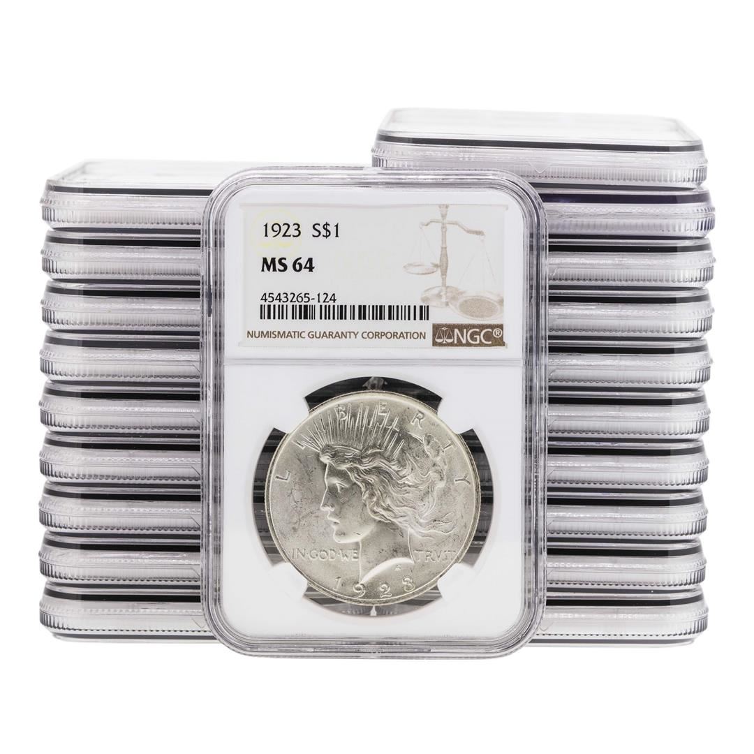 One Lot of (20) 1923 $1 Peace Silver Dollar Coin NGC MS64. NGC Certified.