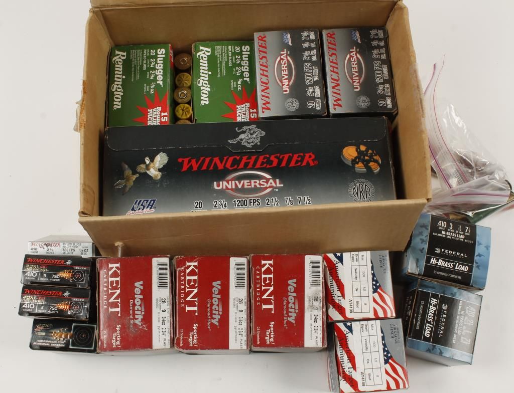 150 rounds of 20GA Winchester 2.75" #7.5 shot. 30 rounds of Remington Slugger 20GA 2.75" 5/8 oz. rifled slugs. 5 rounds of loose 20 GA . 185 total 20 Gauge. 75 rounds of Kent 28 GA 2.75" #9 shot. 4 loose 28GA shells. 79 total 28GA shells. 50 rounds of American Target Ammunition .410 GA 2.5" #8 shot. 25 rounds of Federal .410 GA 3" #7.5 shot. 25 rounds of Federal .410 GA 2.5" #7.5 shot. 20 rounds of Winchester .410 GA PDX1 Defender 3" 4disc and 16 BB shot.5 rounds of Winchester .410 GA 2.5" 1/5 oz. slug. 10 rounds of Winchester .410 GA Supreme Elite 2.5" 3 disc and 12 BB shot. 6 loose .410 GA shells. 141 .410 GA rounds total. 405 shotshells in this lot.