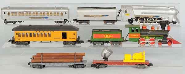 Description Includes a five-piece Franklin Set, 354 silver bullet locomotive, 655 silver bullet passenger car, 934 searchlight car, 930 caboose, 937MKT boxcar, 977 caboose and various other cars. Most are in good to very good condition. Not all pictured.