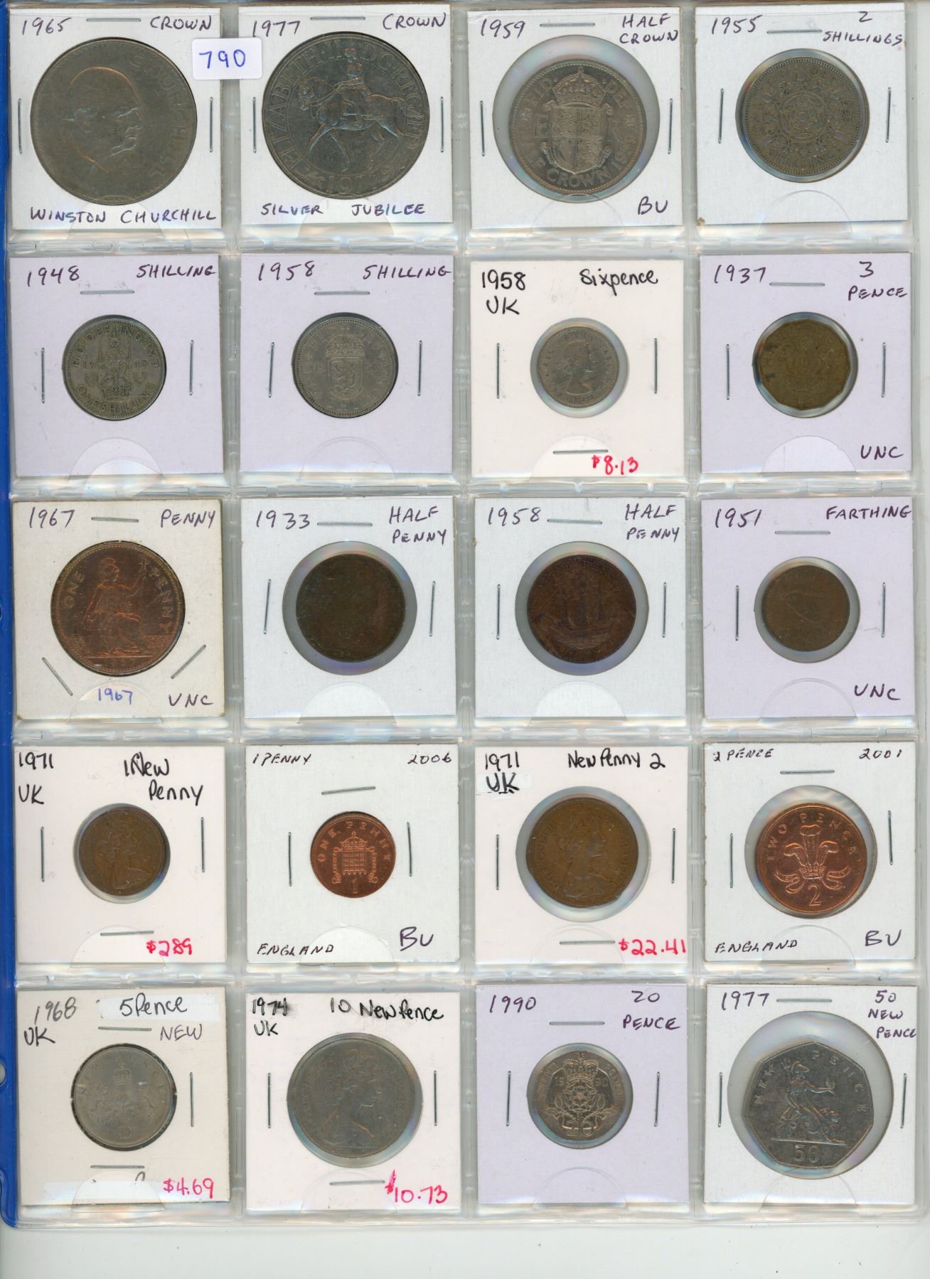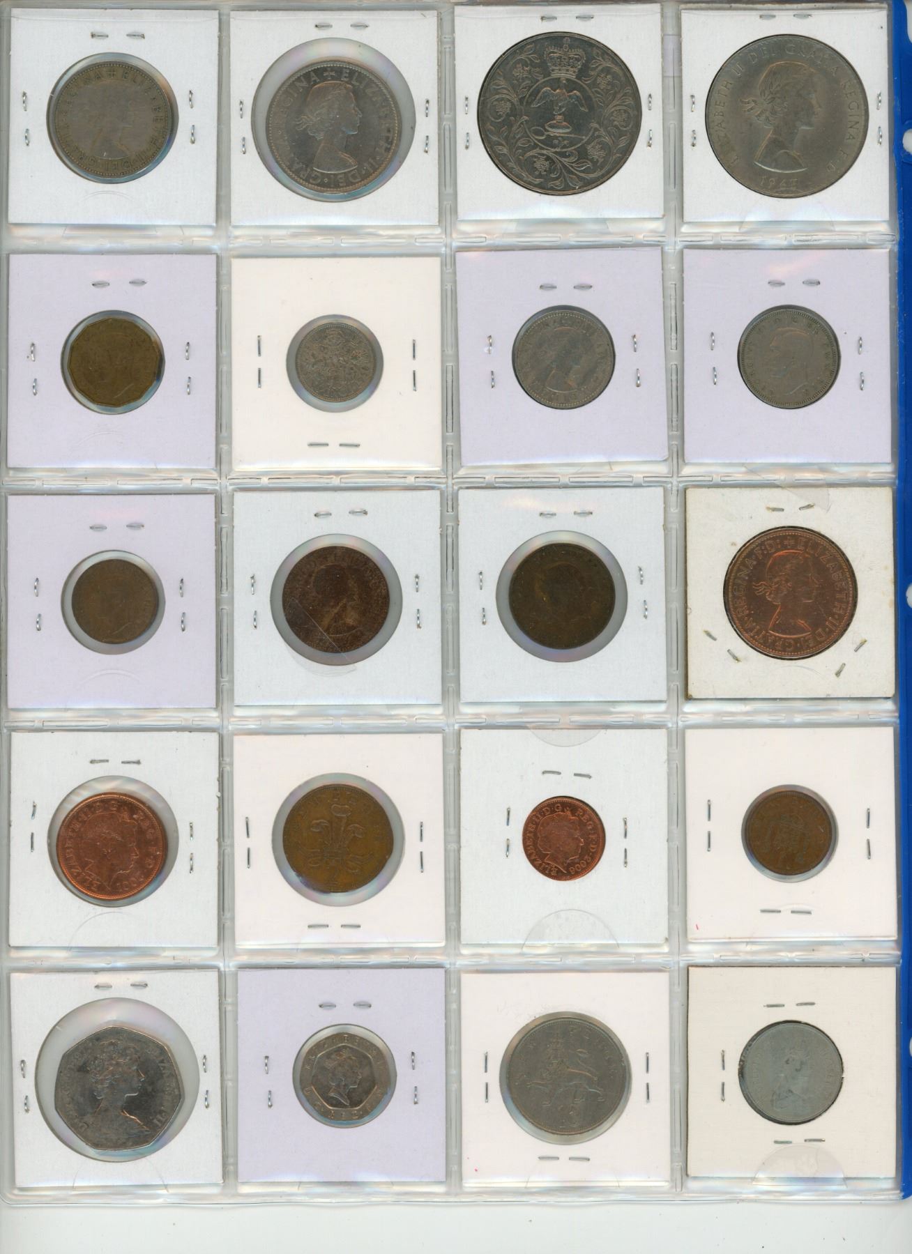 Lot of 20 British coins including 2 commemorative Crowns, Half Crown, 2 Shillings, Shillings, Six Pence, 3 Pence, Penny, Half Pennies, & Farthing plus newer denominations including New Penny, Penny, 2 New Pence, 2 Pence, 5 New Pence, 10 New Pence, 20 Pence & 50 New Pence.