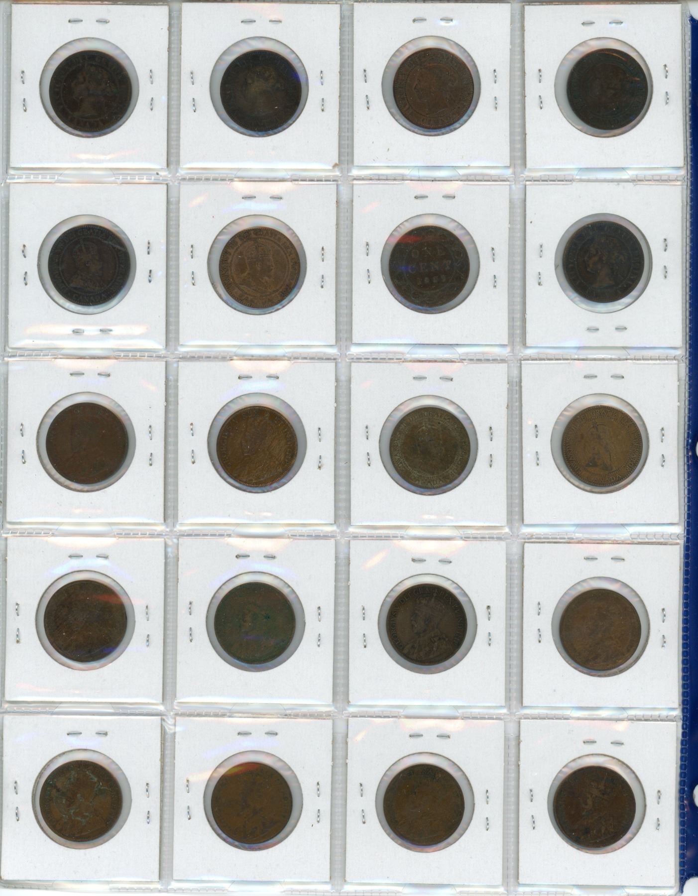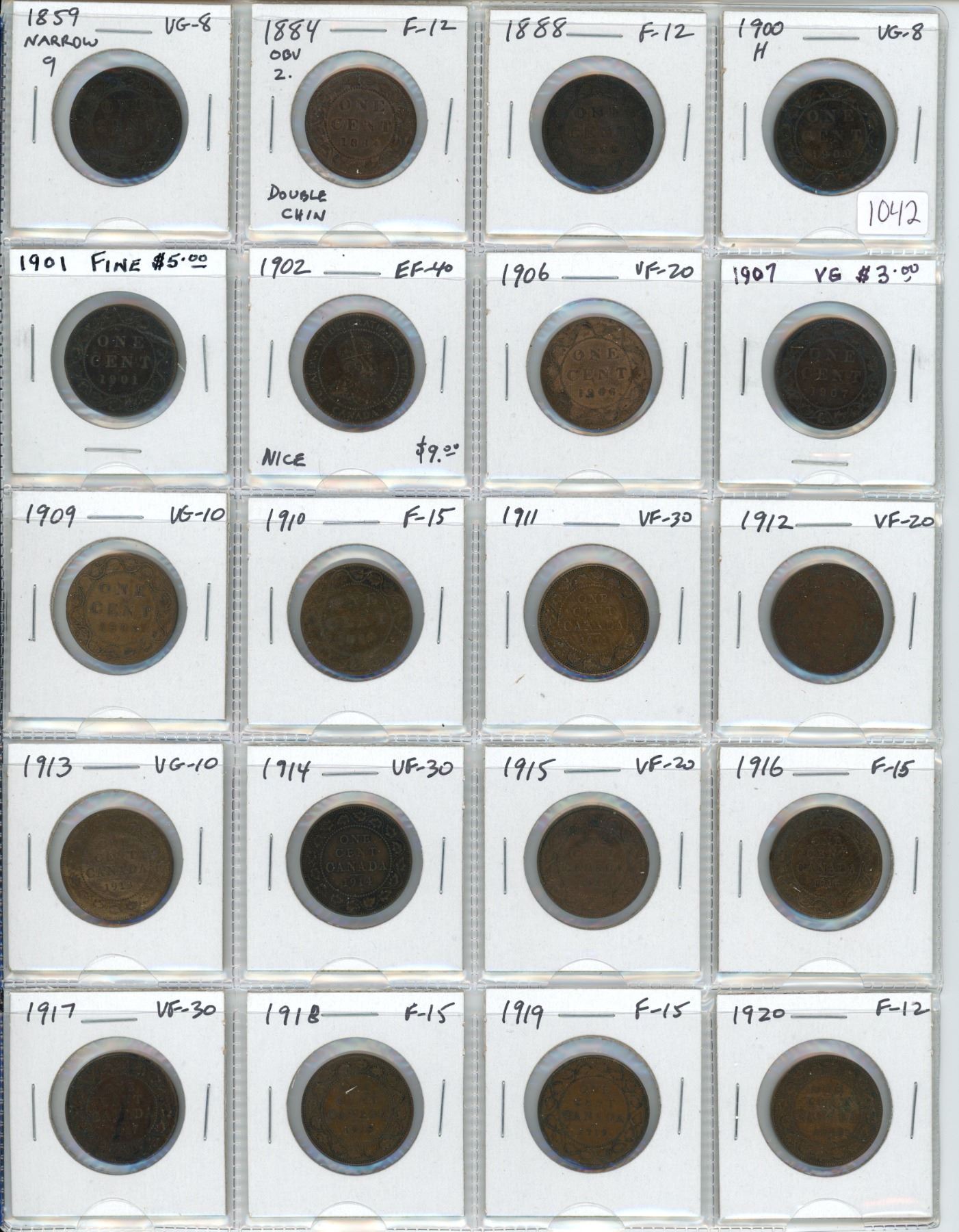Lot of 20 Canadian Large Cents. Includes 1859 Narrow 9, 1884 Obverse 2 (Double Chin), 1888, 1900H, 1901, 1902, 1906, 1907, 1909. 1910, 1911, 1912, 1913, 1914, 1915, 1916, 1917, 1918, 1919 & 1920. Coins grade VG-8 to EF-40. A nice selection.