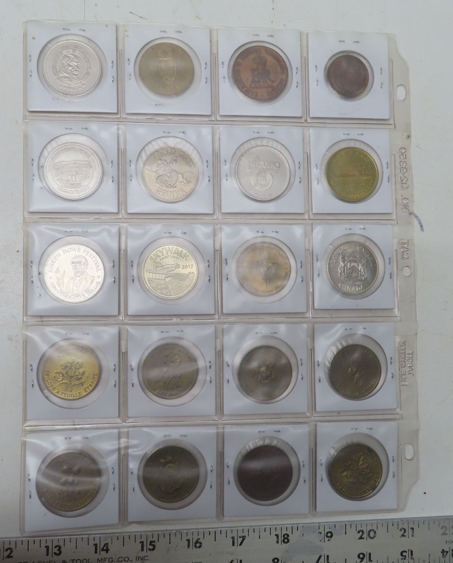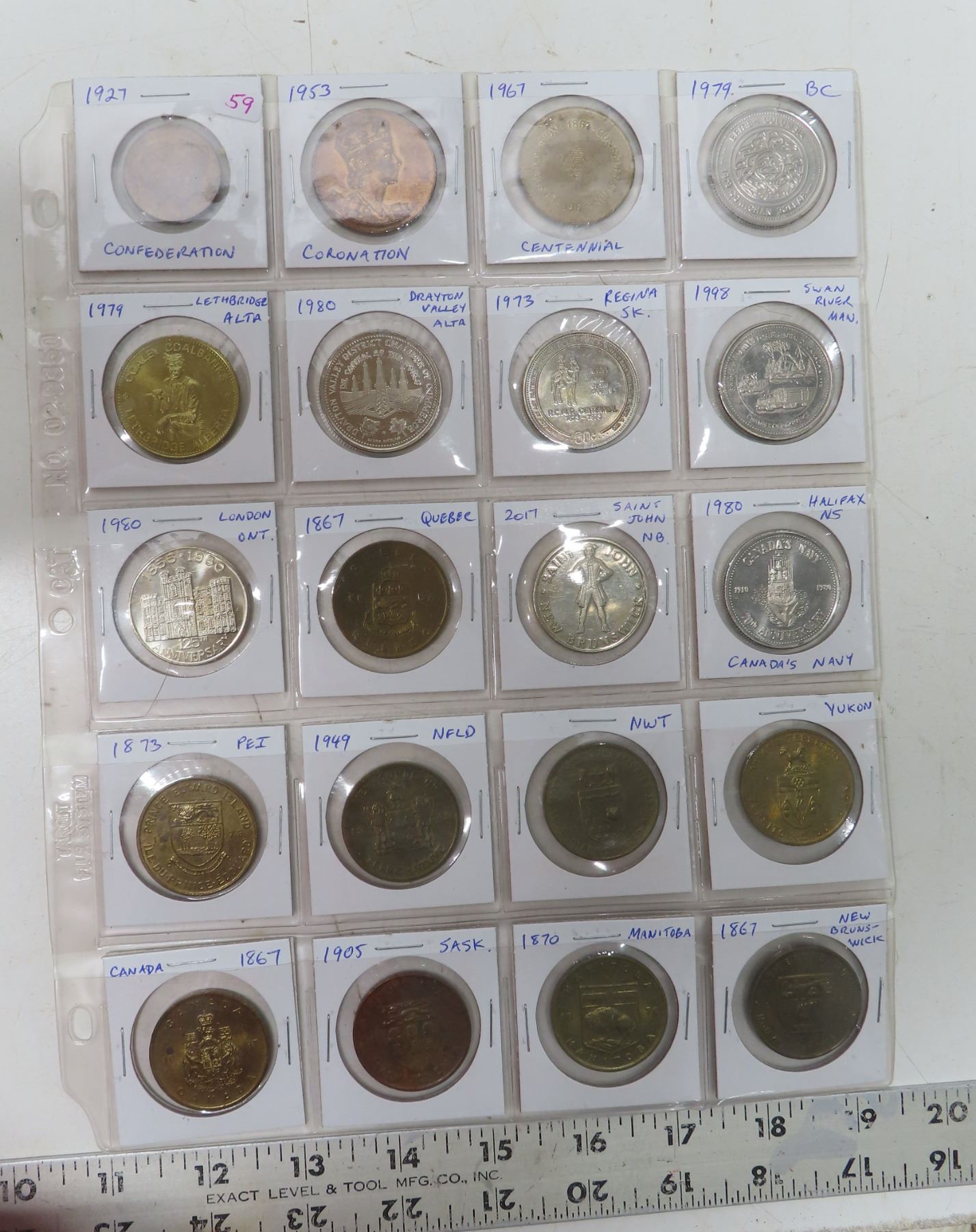 Lot of 20 Canadian Medals & Trade Dollars. Includes 1927 Confederation, 1953 Coronation, 1967 Centennial, plus others from BC, Alberta, Sask., Manitoba, Ontario, Quebec, New Brunswick, Nova Scotia, PEI & Newfoundland.