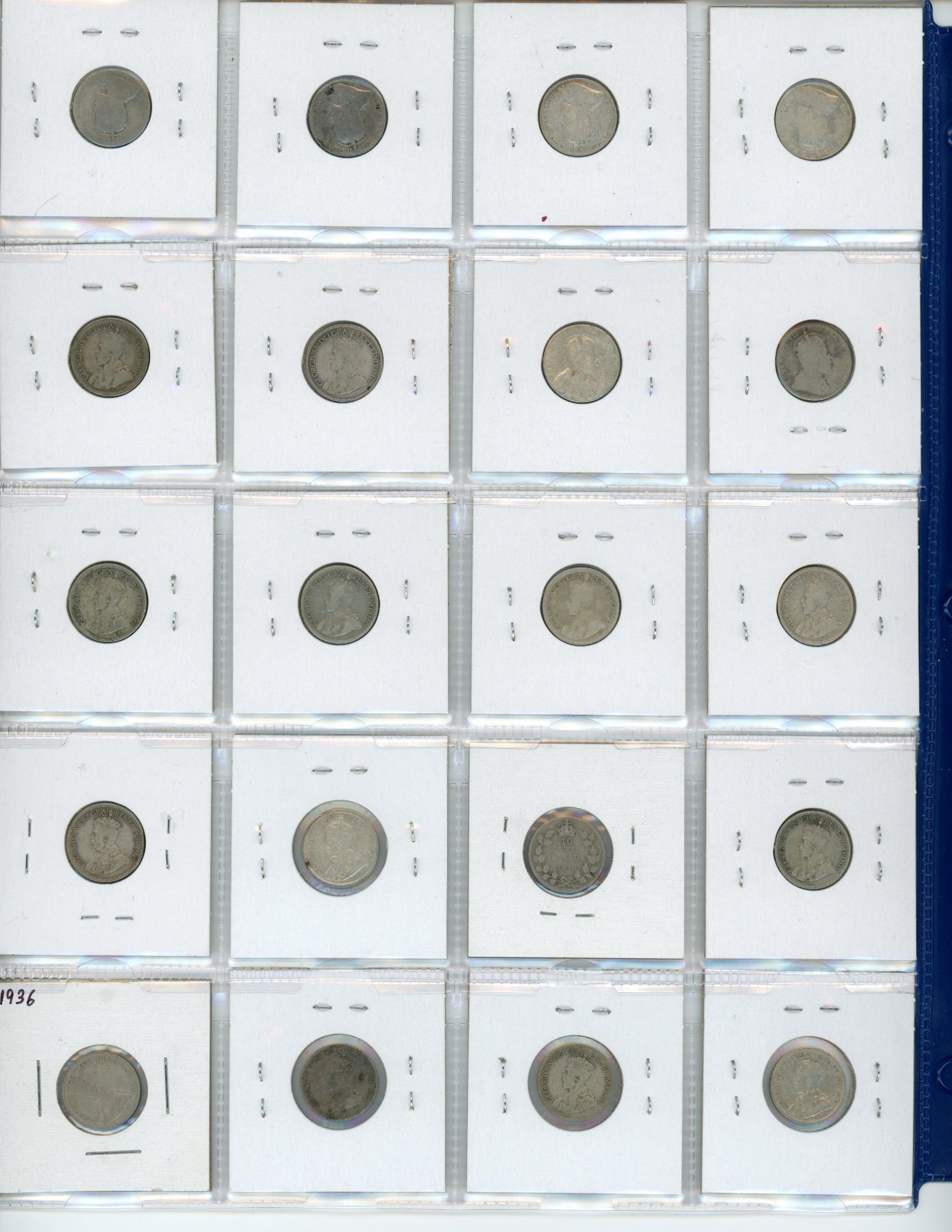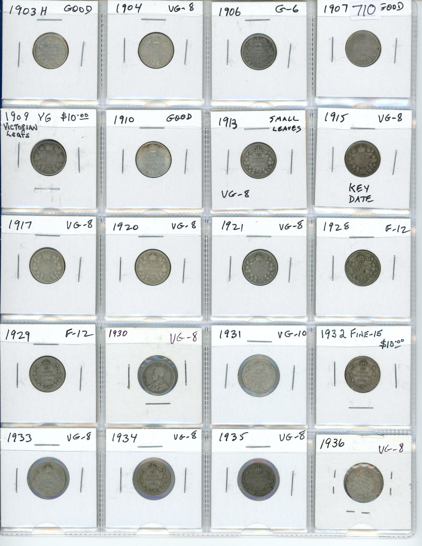 Lot of 20 Canadian Silver 10 Cents. Includes 1903H, 1904, 1906, 1907, 1909 Victorian Leaves, 1910, 1913 Small Leaves, 1915 (Key Date), 1917, 1920, 1921, 1928, 1929, 1930, 1931, 1932, 1933, 1934, 1935 & 1936. Coins grade Good to F-15.