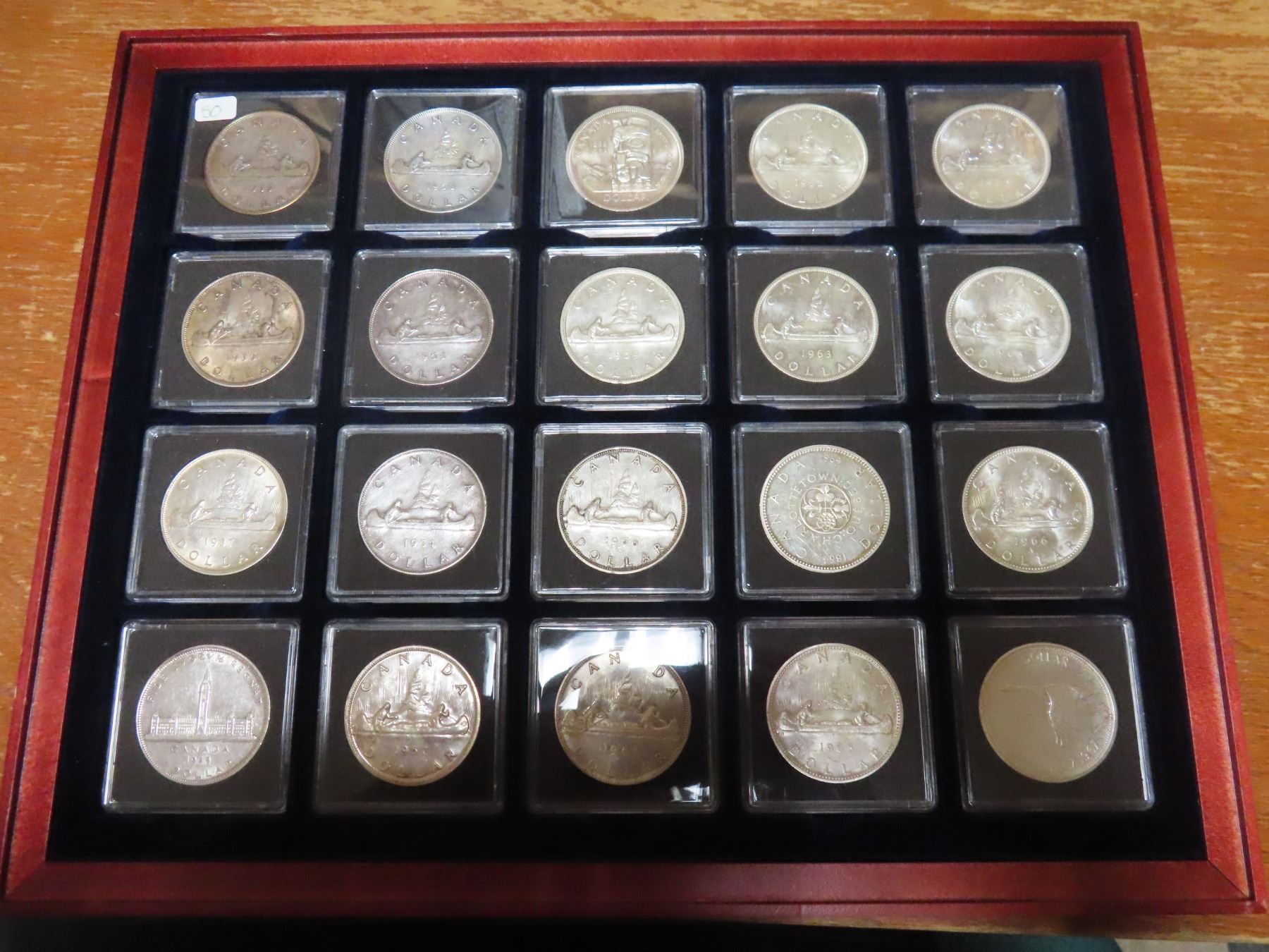 Lot of 20 Canadian Silver Dollars from 1935 to 1967. Housed in hard plastic holders inside a fancy wooden case. Coins grade up to Brilliant Uncirculated.