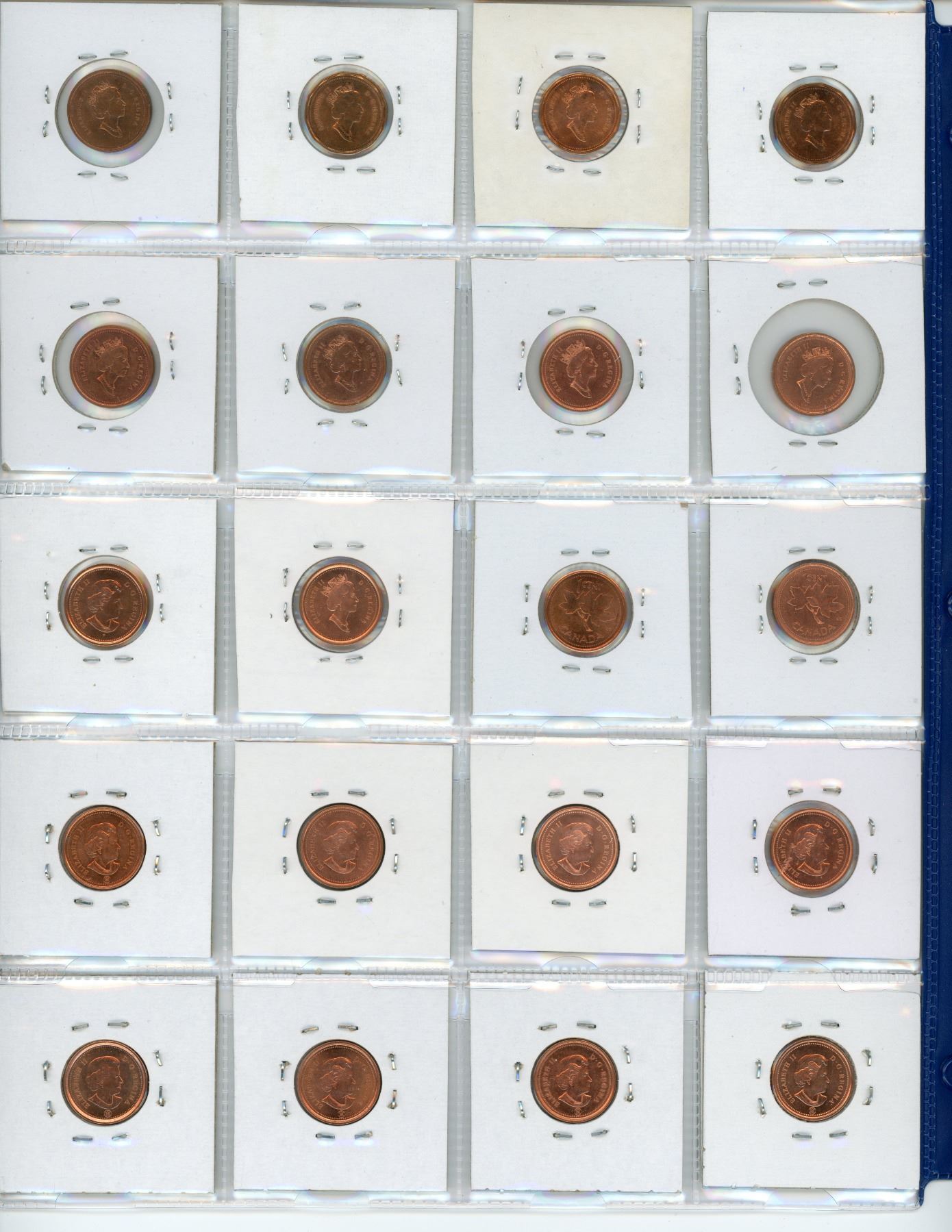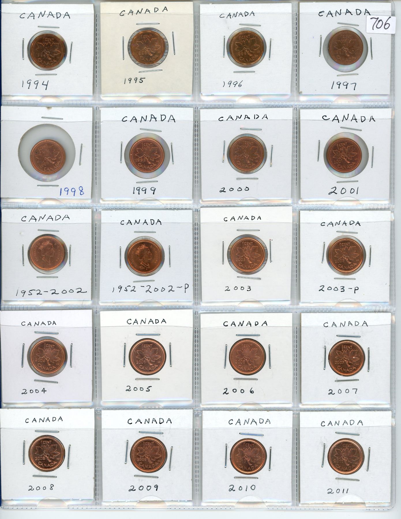 Lot of 20 Canadian Small Cents 1994 – 2011. Includes 1994, 1995, 1996, 1997, 1998, 1999, 2000, 2001, 2002, 2002P, 2003, 2003P, 2004, 2005, 2006, 2007, 2008, 2009, 2010 & 2011. All Coins Brilliant Uncirculated.