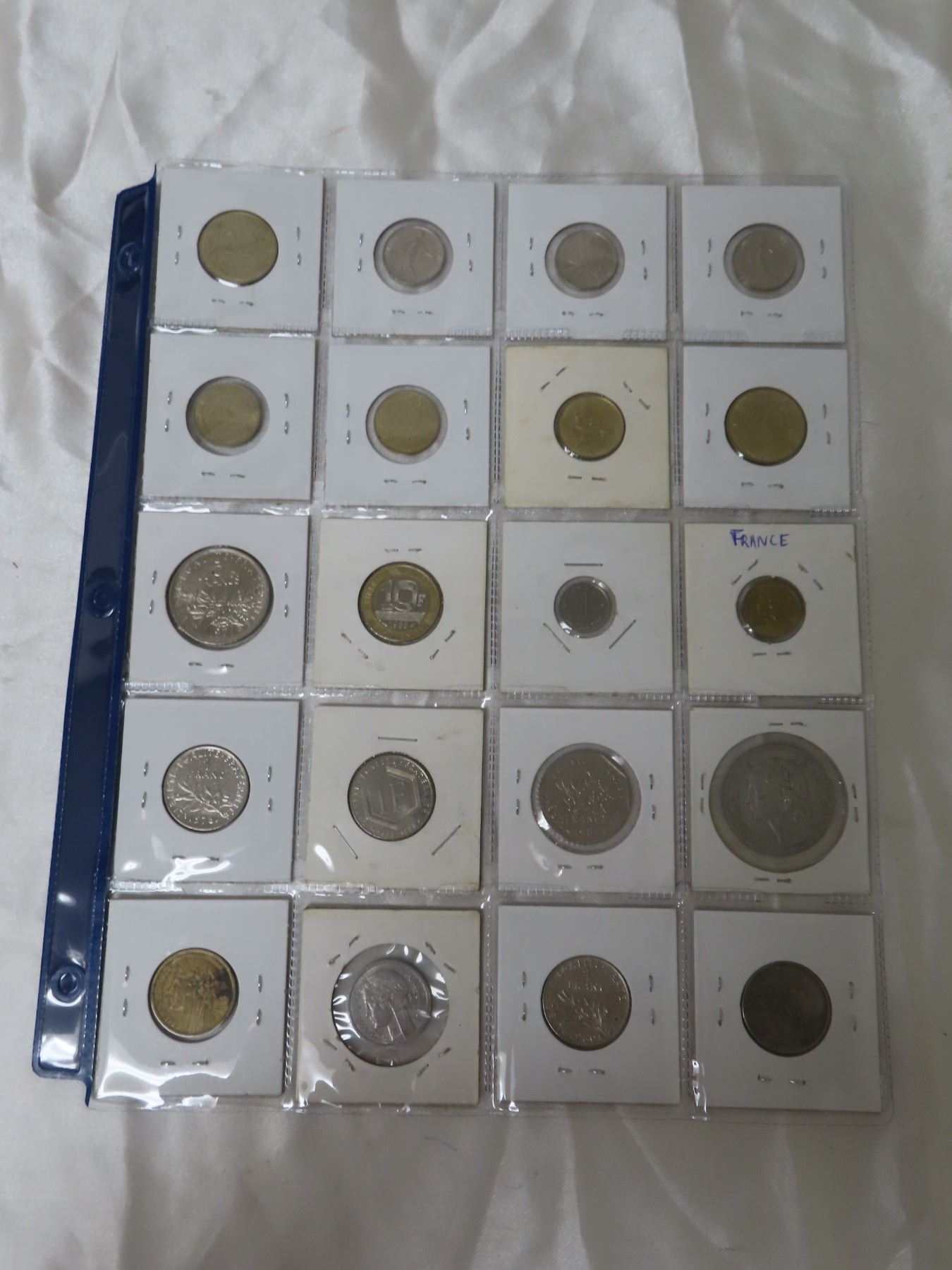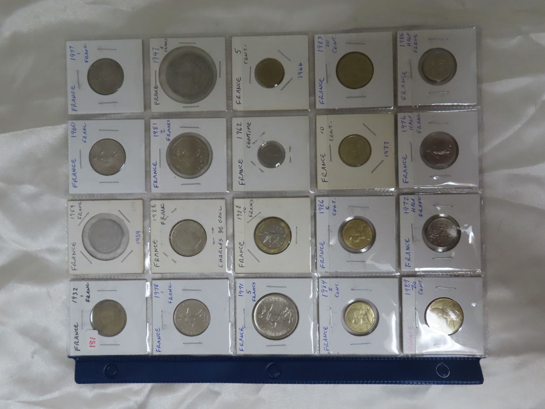 Lot of 20 French coins including 1932 Franc and many high value denominations up to 10 Francs.