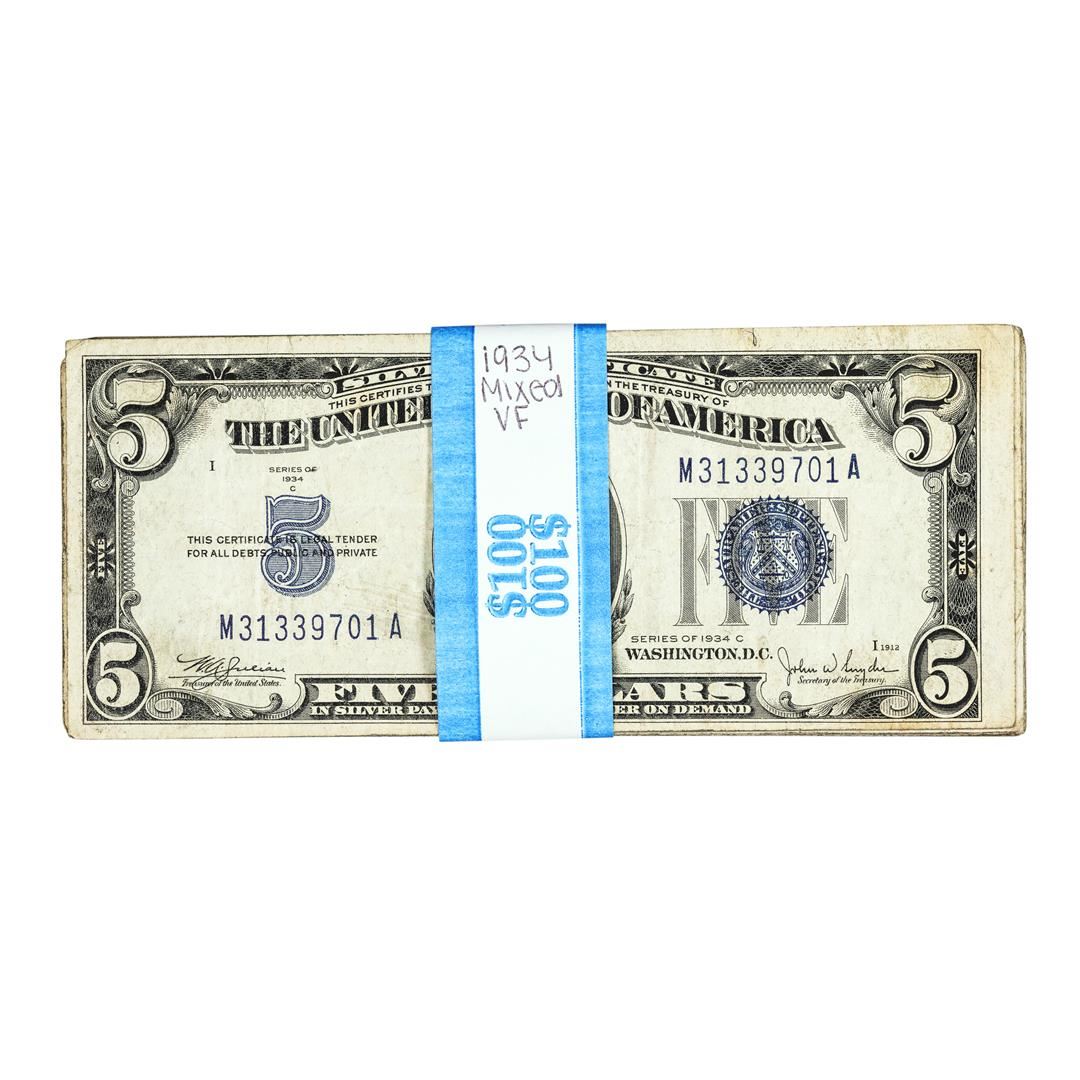 Lot of (20) Mixed Series 1934 $5 Silver Certificate Notes - Very Fine
